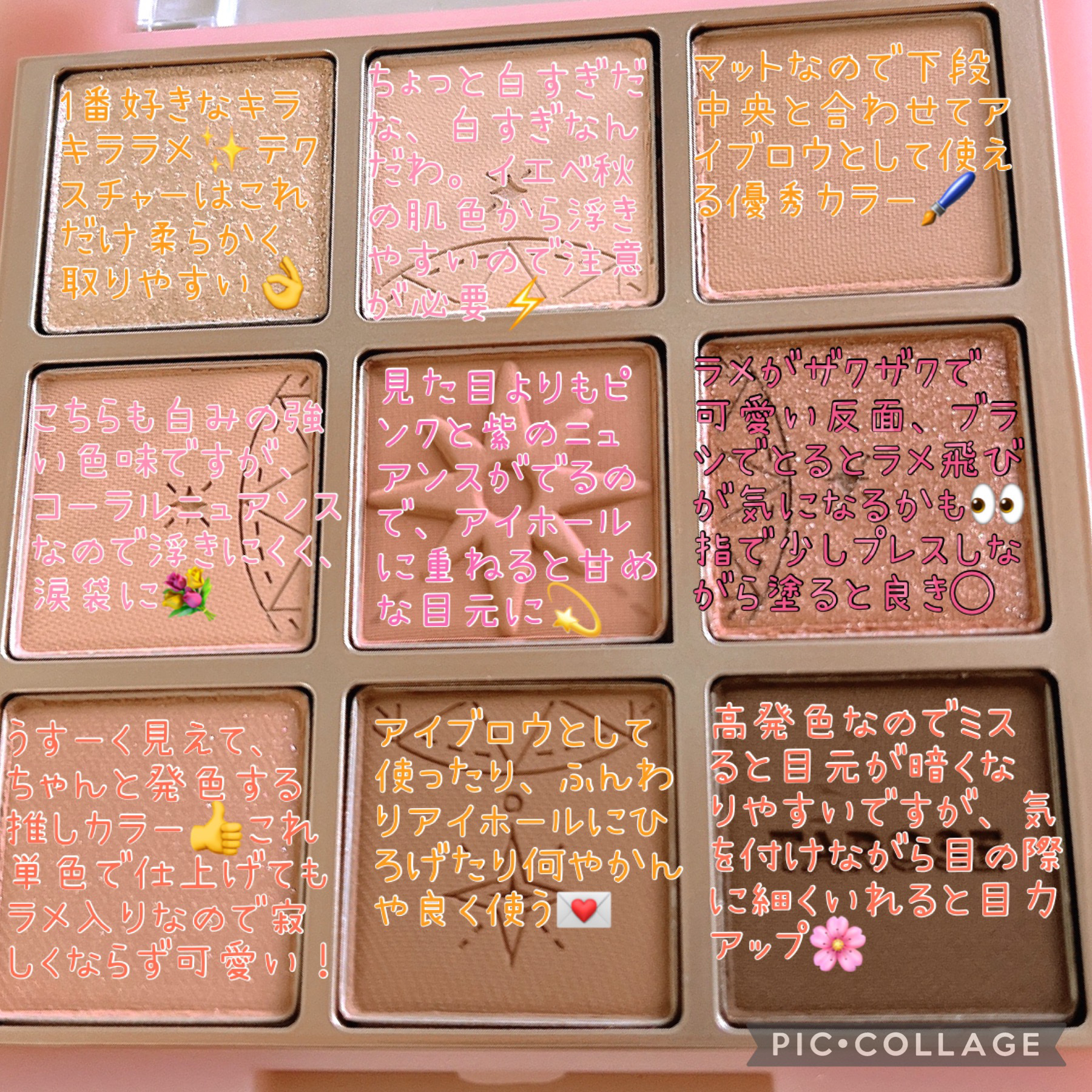 クラシックなローズトープカラーパレット ・ブラウン難民だけど、これはちゃんと使えるブラウン(感謝) このパレット一つで完成できる ・ほかのHOLIKA HOKIKAの単色アイシャドウとの相性ももちろん良い^^ 優しげ風(当社比)にしたい時は右の列メイン キリッと系にしたい時は②.④/⑥.⑧+ラメなどなど組み合わせて使えます