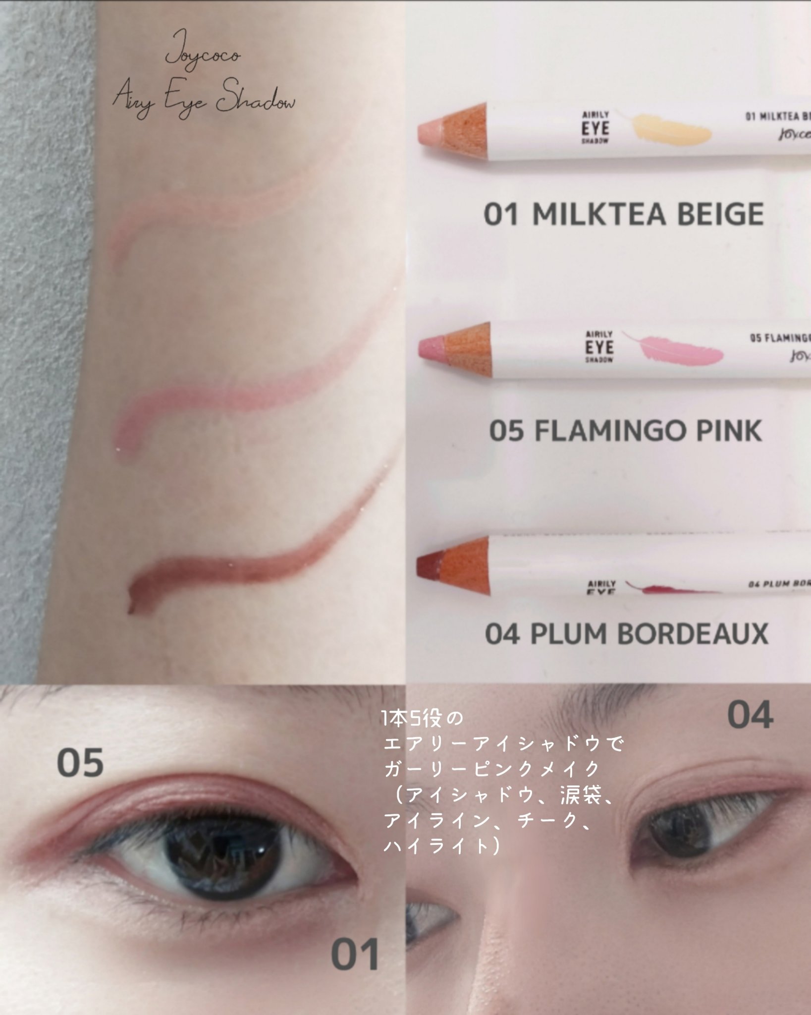 - スティックなのにパウダー。1本で思い通りのアイメイクが自由自在に描ける「ジョイココ エアリーアイシャドウ」。1本でアイメイクが完成できることを目指した新体験のアイシャドウ。指で優しく撫でるだけで好みのグラデーションを演出し、スティックだから気になる部分はピンポイントで狙えます。パウダーを優しく芯に閉じ込める特殊な技術で、ふんわり羽のように軽いエアリー感のある書き心地を実現。アイシャドウだけではなく、涙袋・ハイライト・チークにも使えます。
