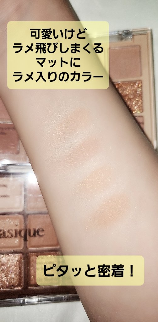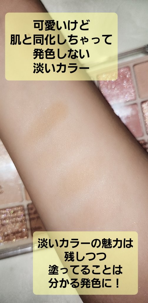完全にパケに一目惚れ(笑)これは幾つかお迎えしよう!と思ったものの2,420円。 使用感としては、粉質はサラサラタイプ ✅発色は右下のダークブラウン以外は優しめといった感じ。 マット、マットにラメ、パール、ラメ、グリッターに近いラメ、全部入っている欲張りパレット ✅パケは紙製なので大きさに対して意外と軽量という点も高ポイント◎