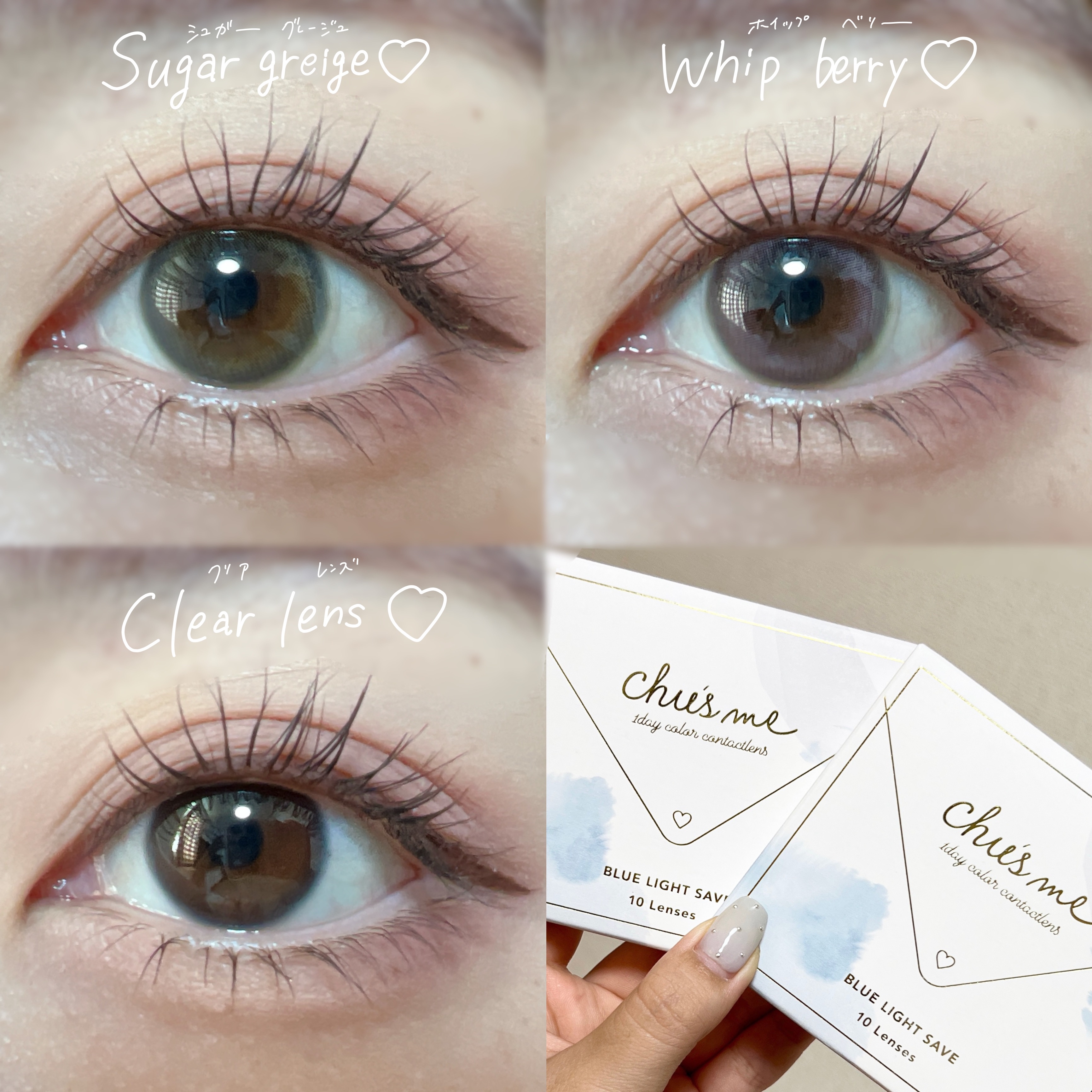 - 「ふんわりフチ×まろみカラー」が特徴の新色は、日常使いしやすくカラコン初心者の方でも使っていただけるような繊細なデザインにもこだわりました。 今日の気分はどっち?♡その日の気分で選べる全5色のラインナップ。 ●Marron latte(マロンラテ) さりげなく、可愛さを仕込む。ほろあまマロンブラウン。 ●Milky chai(ミルキーチャイ) 吸い込まれるような、透明感。ふんわりミルキーベージュ。 ●Melty cocoa(メルティーココア) 一度はまったら、抜け出せない。とろつやココアブラウン。 ●Whip berry (ホイップベリー)ほろっと甘く、愛らしさ溢れるとろけるホイップベリー ●Sugar greige(シュガーグレージュ)溶け込むように馴染む瞳に、甘さをひとさじ最旬シュガーグレージュ カラーコンタクトレンズの不適正使用による眼障害の危険性等などがあります。 ●コンタクトレンズは高度管理医療機器です。不十分な洗浄・消毒など不適切なケアや、長時間・交換期間を超えた装用により、アレルギー性結膜炎、角膜感染症、角膜潰瘍等の重篤な眼障害が発生する危険性があります ●ご使用前に取扱説明書を確認してください 使用上の留意事項 ●眼科医院等を受診してからお求めください ●眼に異常を感じたら直ちにレンズ使用を中止し、お近くの眼科等で診察を受けてください ●医師の指示にしたがってご使用ください ●コンタクトレンズを装用する場合、自覚症状がなくても、眼科医院等での定期検査を受けてください ●レンズに不具合がある場合は使用しないでください