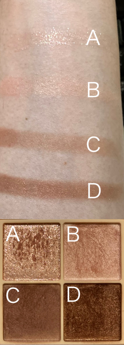 - ラメ・パール・マット3質感の4色アイシャドウ。 肌馴染みの良いベージュを基調としたカラー。ラメ・パール・マットの3質感を重ねて、自然にまぶたを強調し奥行のある大きな目元へ。 しっとり溶け込むような柔らかなパウダーなので、スルスル伸びてまぶたにピタッと密着。保湿成分(スクワラン・ホホバ種子油)配合。