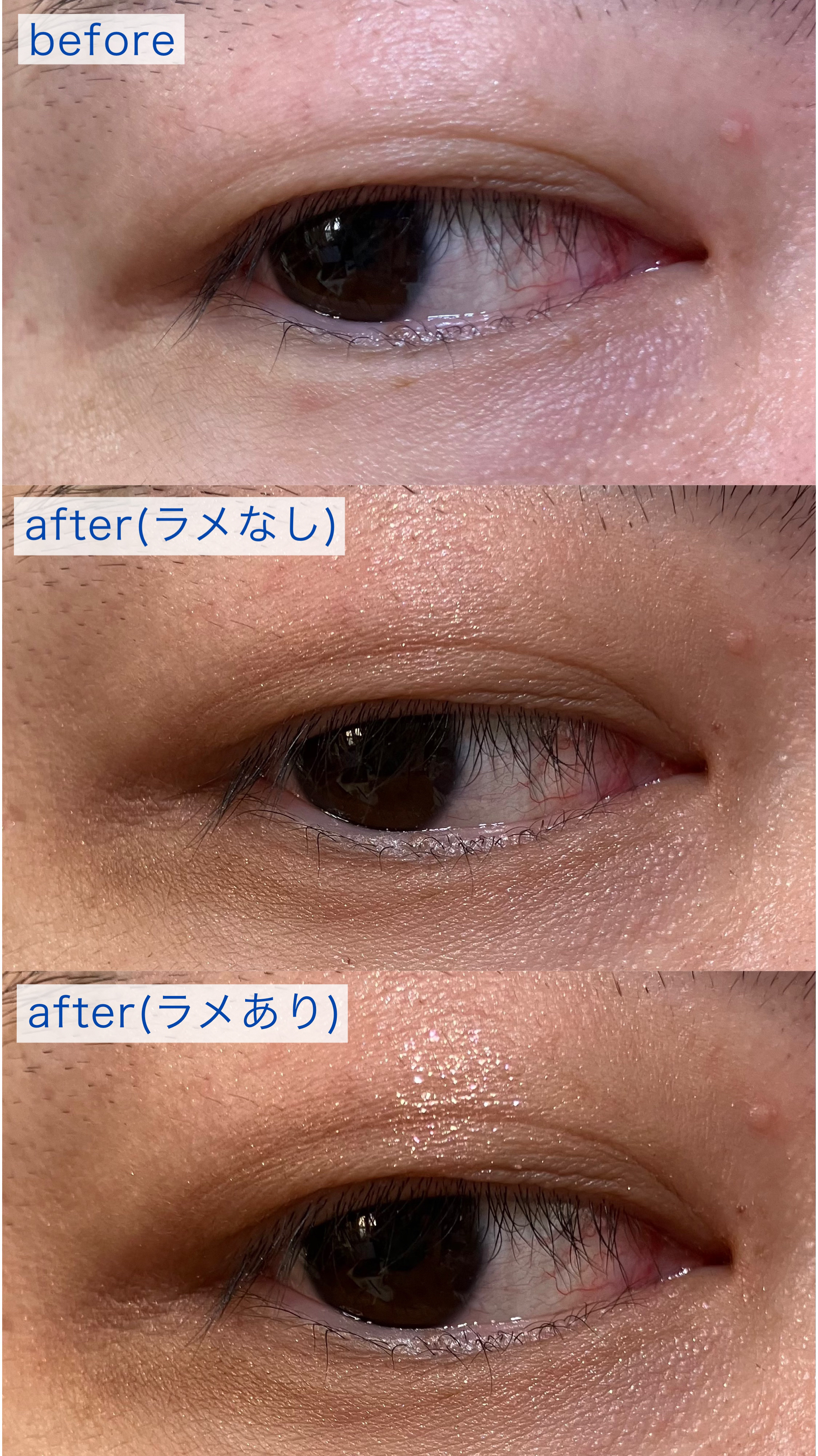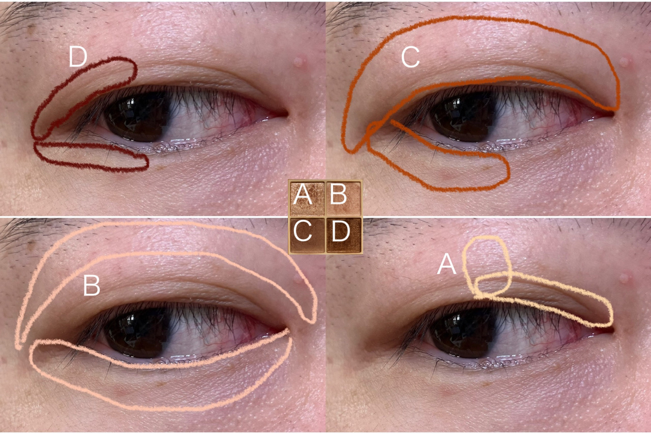 ラメ ピンク、白、ベージュなどの色が混ざっているように思います。 セミマット 青みも黄みもない淡いベージュです。わずかにパール感があります。 Cを上瞼の目尻のみにライン状に塗布します。
