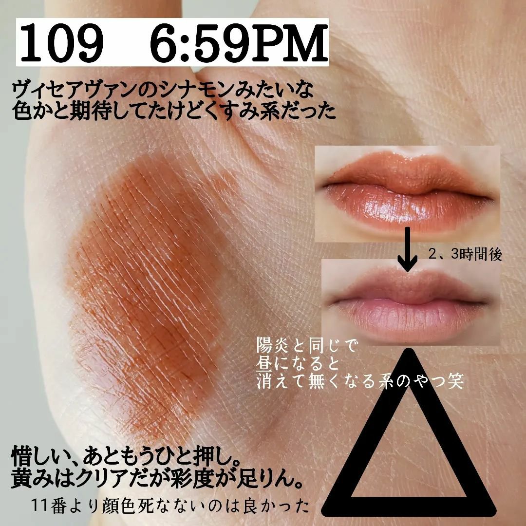 私もこの2つ買いました! 108は時間経つと青み出てきますよね。 塗り立てはめちゃくちゃ可愛いんですけどね! 塗り立ての色がキープできたらいいのになー リプモンって基本青み多いですよね。 109は私も顔色良くはならなかったけど、 悪くもらならなかったのでブラウンの中では お気に入りです!顔色良くなるブラウンにはまだ 出会ったことないんですが、 ヴィセのシナモンいいんですか? チェックしてみます!