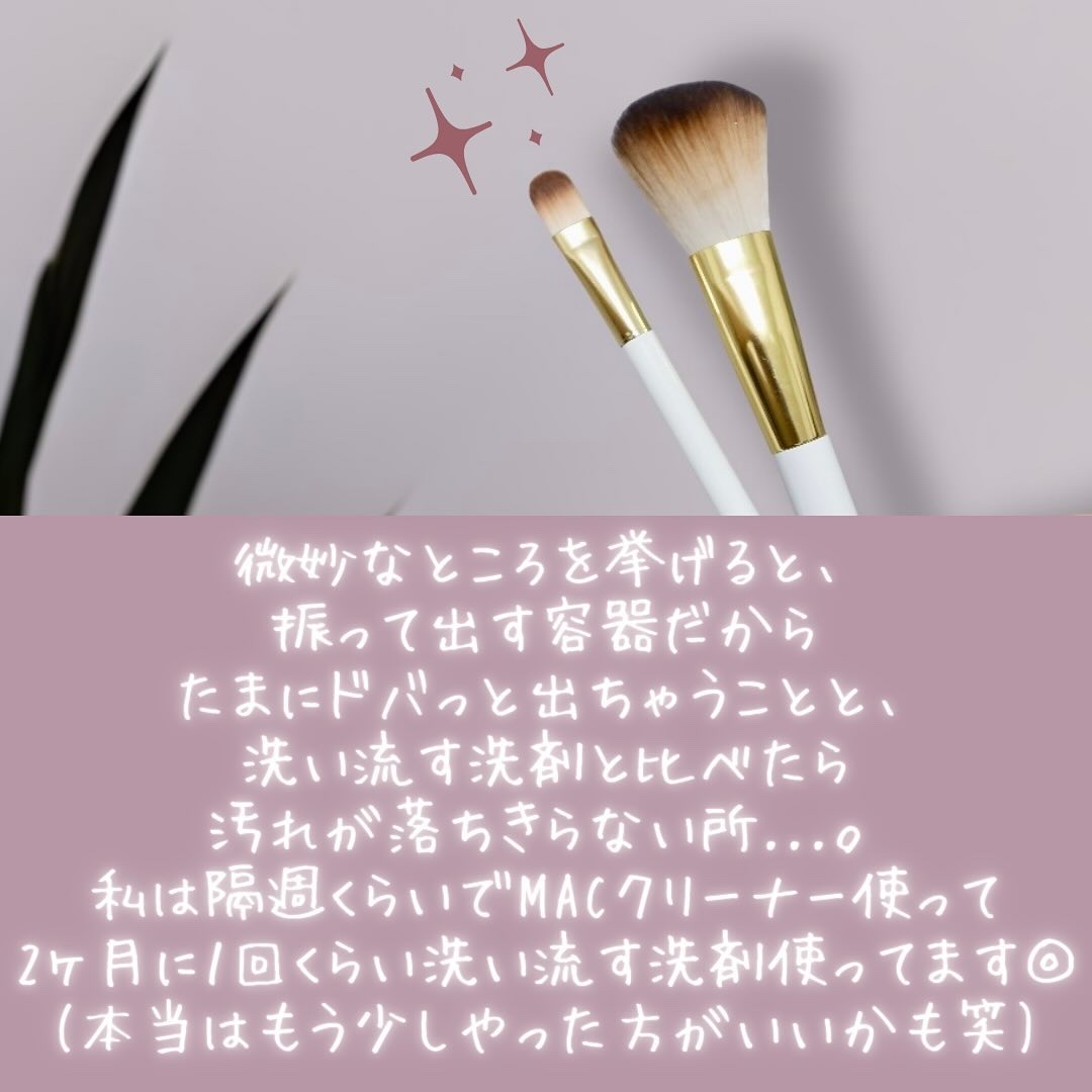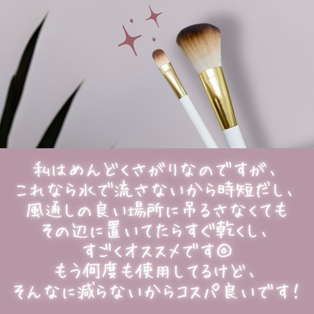 使用方法は簡単でティッシュやコットンに適量出して液が付いたところにブラシをくるくるさせると汚れがどんどん取れていきます! 完全に綺麗になるわけではないので定期的に水と洗剤で洗う必要はありますが週1回の簡単なお手入れとして使用しています! 手軽にできるので夜寝る前など気がついた時にくるくるさせて綺麗なブラシでメイクできればもっと気分も上がるかな!と思います!