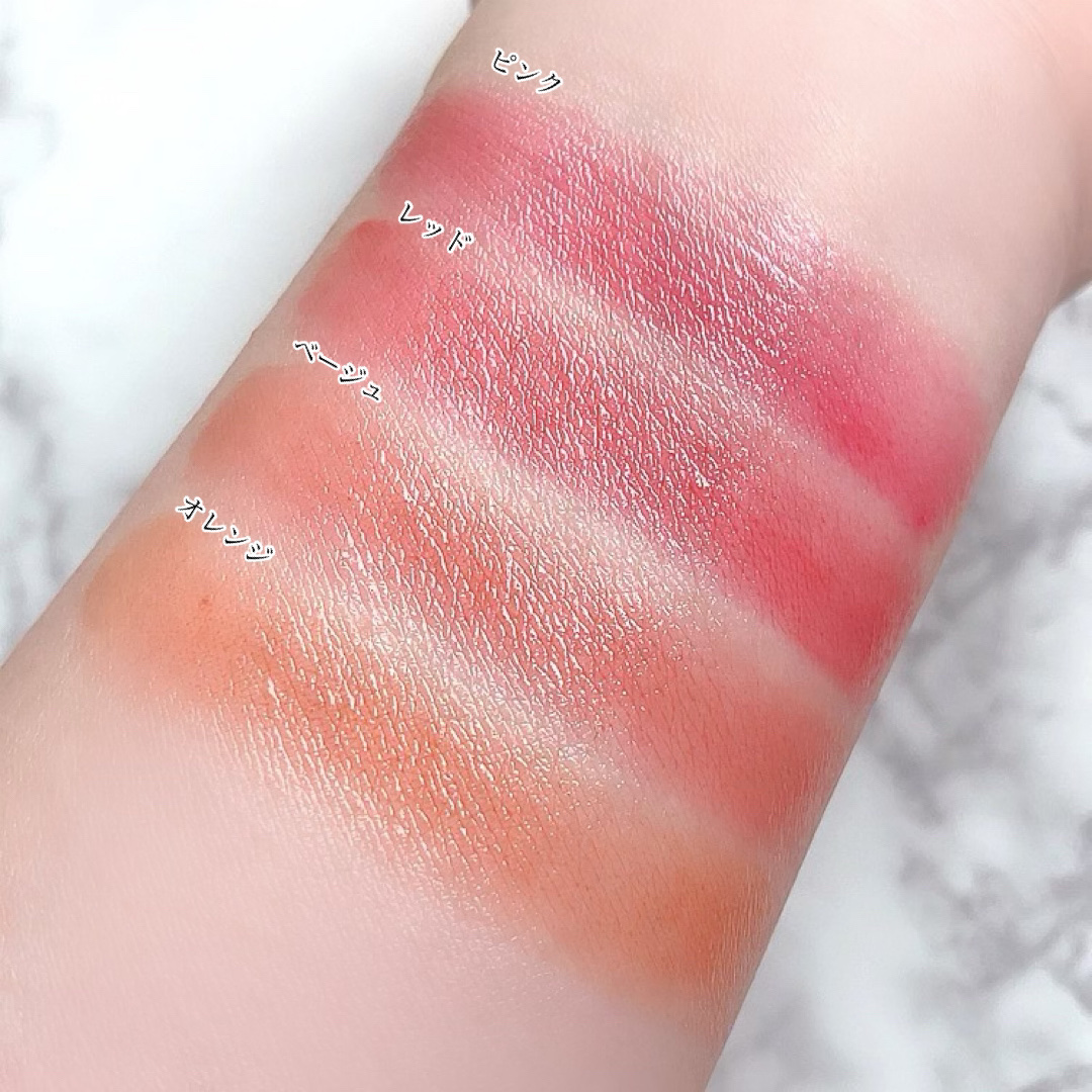 - <ピンク> スクワラン、トリ(カプリル酸/カプリン酸)グリセリル、パラフィン、水添ポリイソブテン、リンゴ酸ジイソステアリル、メトキシケイヒ酸エチルヘキシル、ビスジグリセリルポリアシルアジペート-2、トリポリヒドロキシステアリン酸ジペンタエリスリチル、ワセリン、シア脂、ポリエチレン、水添野菜油、アボカド油、トリイソステアリン酸ポリグリセリル-2、マイクロクリスタリンワックス、t-ブチルメトキシジベンゾイルメタン、オリーブ果実油、(VP/エイコセン)コポリマー、酸化チタン、ペンチレングリコール、黄4、赤202、赤201、マイカ、赤218、ホホバ種子油、アルガニアスピノサ核油、水酸化Al、酸化スズ <ブラウン> スクワラン、トリ(カプリル酸/カプリン酸)グリセリル、パラフィン、水添ポリイソブテン、メトキシケイヒ酸エチルヘキシル、リンゴ酸ジイソステアリル、ビスジグリセリルポリアシルアジペート-2、トリポリヒドロキシステアリン酸ジペンタエリスリチル、ワセリン、シア脂、ポリエチレン、水添野菜油、アボカド油、トリイソステアリン酸ポリグリセリル-2、マイクロクリスタリンワックス、t-ブチルメトキシジベンゾイルメタン、酸化鉄、(VP/エイコセン)コポリマー、オリーブ果実油、青1、ペンチレングリコール、酸化チタン、マイカ、赤223、ホホバ種子油、アルガニアスピノサ核油、酸化スズ <ベージュ> スクワラン、トリ(カプリル酸/カプリン酸)グリセリル、パラフィン、水添ポリイソブテン、リンゴ酸ジイソステアリル、メトキシケイヒ酸エチルヘキシル、ビスジグリセリルポリアシルアジペート-2、トリポリヒドロキシステアリン酸ジペンタエリスリチル、ワセリン、シア脂、ポリエチレン、水添野菜油、アボカド油、トリイソステアリン酸ポリグリセリル-2、マイクロクリスタリンワックス、t-ブチルメトキシジベンゾイルメタン、酸化チタン、酸化鉄、(VP/エイコセン)コポリマー、オリーブ果実油、ペンチレングリコール、マイカ、黄4、赤202、酸化スズ、水酸化Al、赤223、ホホバ種子油、アルガニアスピノサ核油 <レッド> スクワラン、トリ(カプリル酸/カプリン酸)グリセリル、パラフィン、水添ポリイソブテン、リンゴ酸ジイソステアリル、メトキシケイヒ酸エチルヘキシル、ビスジグリセリルポリアシルアジペート-2、トリポリヒドロキシステアリン酸ジペンタエリスリチル、ワセリン、シア脂、ポリエチレン、水添野菜油、アボカド油、トリイソステアリン酸ポリグリセリル-2、マイクロクリスタリンワックス、t-ブチルメトキシジベンゾイルメタン、(VP/エイコセン)コポリマー、オリーブ果実油、酸化チタン、ペンチレングリコール、黄4、赤201、マイカ、赤202、酸化スズ、赤218、ホホバ種子油、アルガニアスピノサ核油 <オレンジ> スクワラン、トリ(カプリル酸/カプリン酸)グリセリル、パラフィン、水添ポリイソブテン、リンゴ酸ジイソステアリル、メトキシケイヒ酸エチルヘキシル、ビスジグリセリルポリアシルアジペート-2、トリポリヒドロキシステアリン酸ジペンタエリスリチル、ワセリン、シア脂、ポリエチレン、水添野菜油、アボカド油、トリイソステアリン酸ポリグリセリル-2、マイクロクリスタリンワックス、t-ブチルメトキシジベンゾイルメタン、酸化鉄、(VP/エイコセン)コポリマー、オリーブ果実油、ペンチレングリコール、黄4、酸化チタン、マイカ、赤223、ホホバ種子油、アルガニアスピノサ核油、酸化スズ