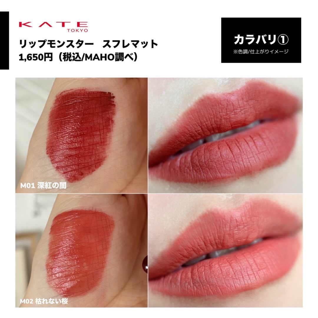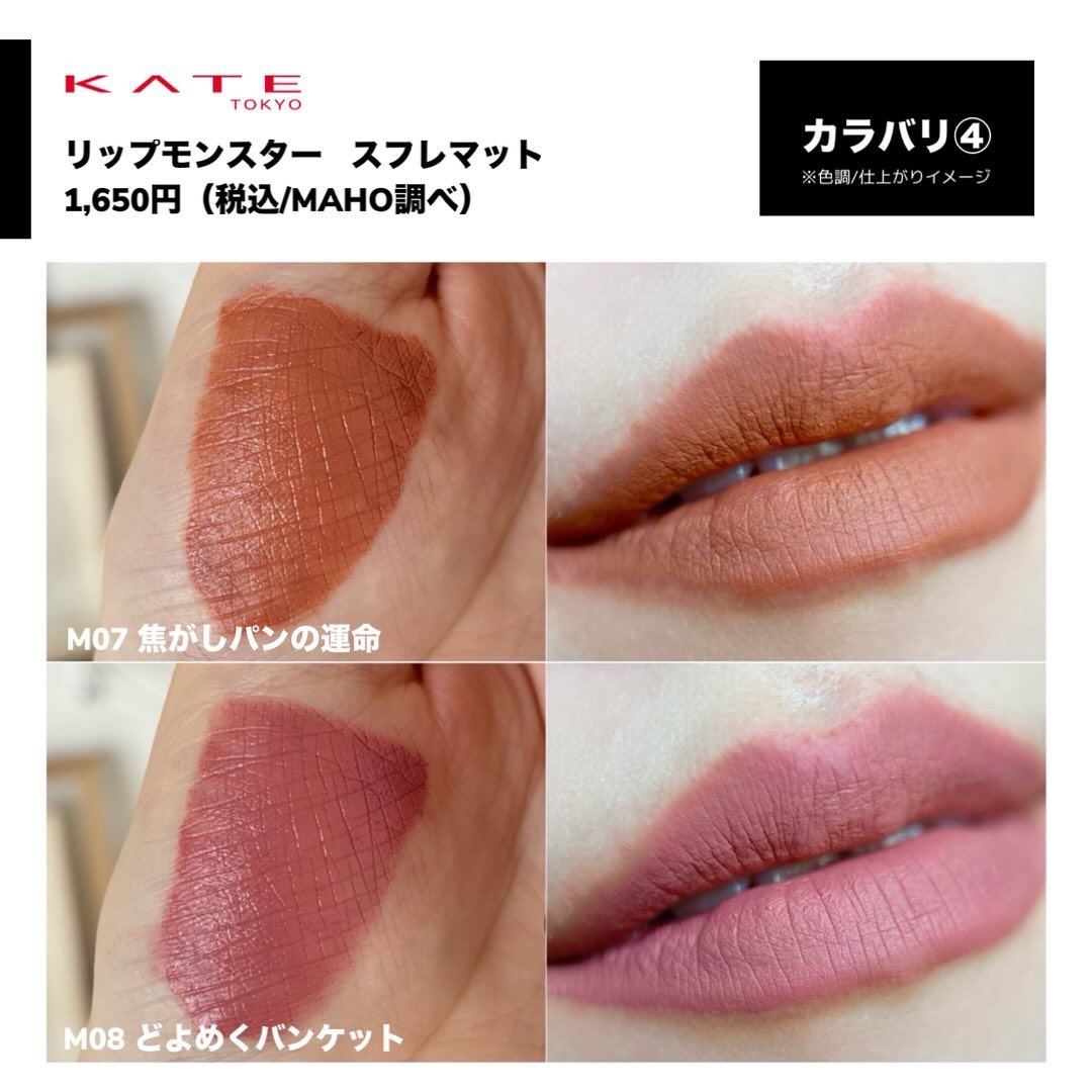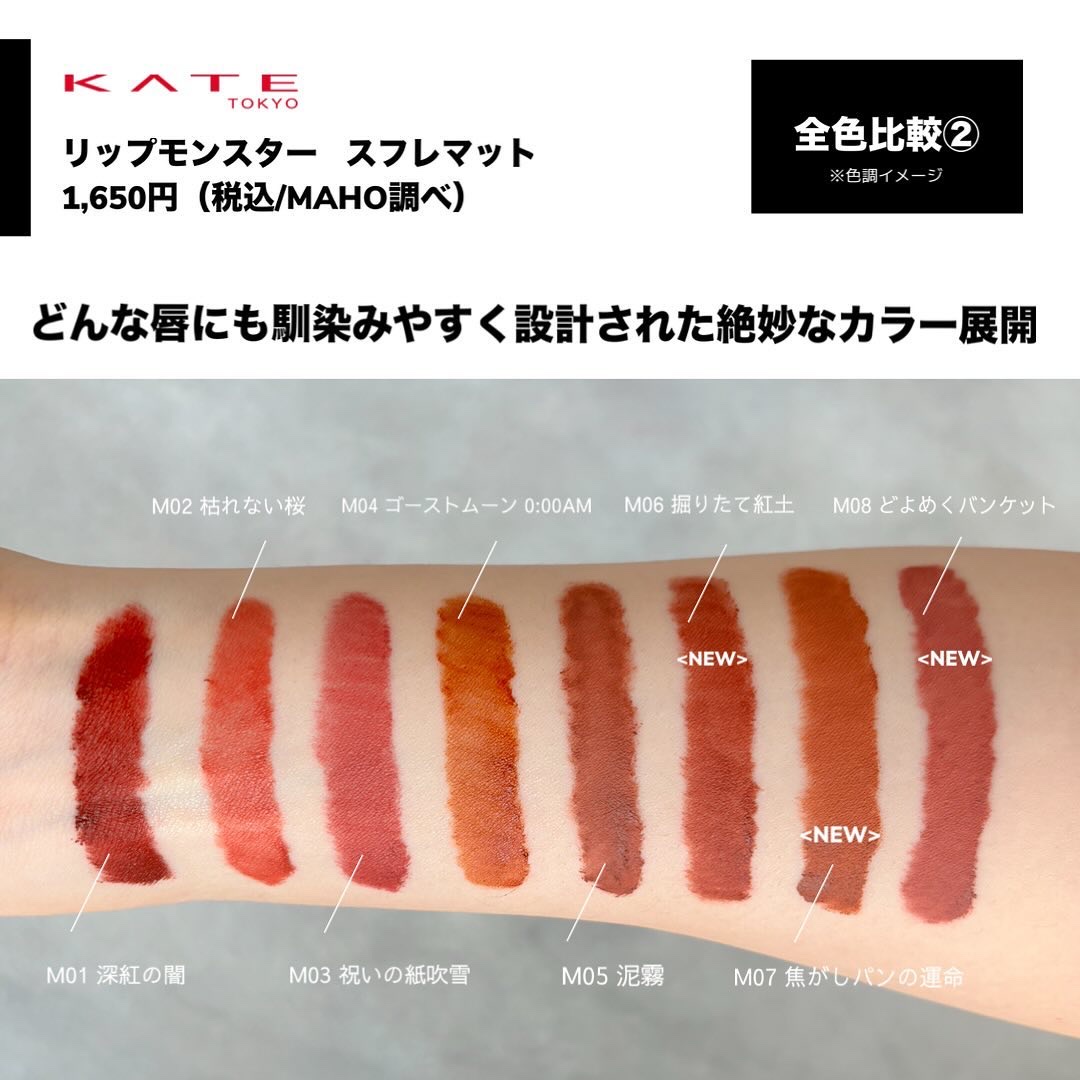 #提供❁.˚‧º‧‧º·˚.❁ リプモン スフレマット 4色スウォッチ❁.˚‧º‧‧º·˚.❁KATEリップモンスタースフレマットをお試し✧*˚₊‧ੈ✩おすすめポイントੈ✩‧₊˚*⋆つけたての色が長時間持続⋆ふんわりマット質感に変化する落...