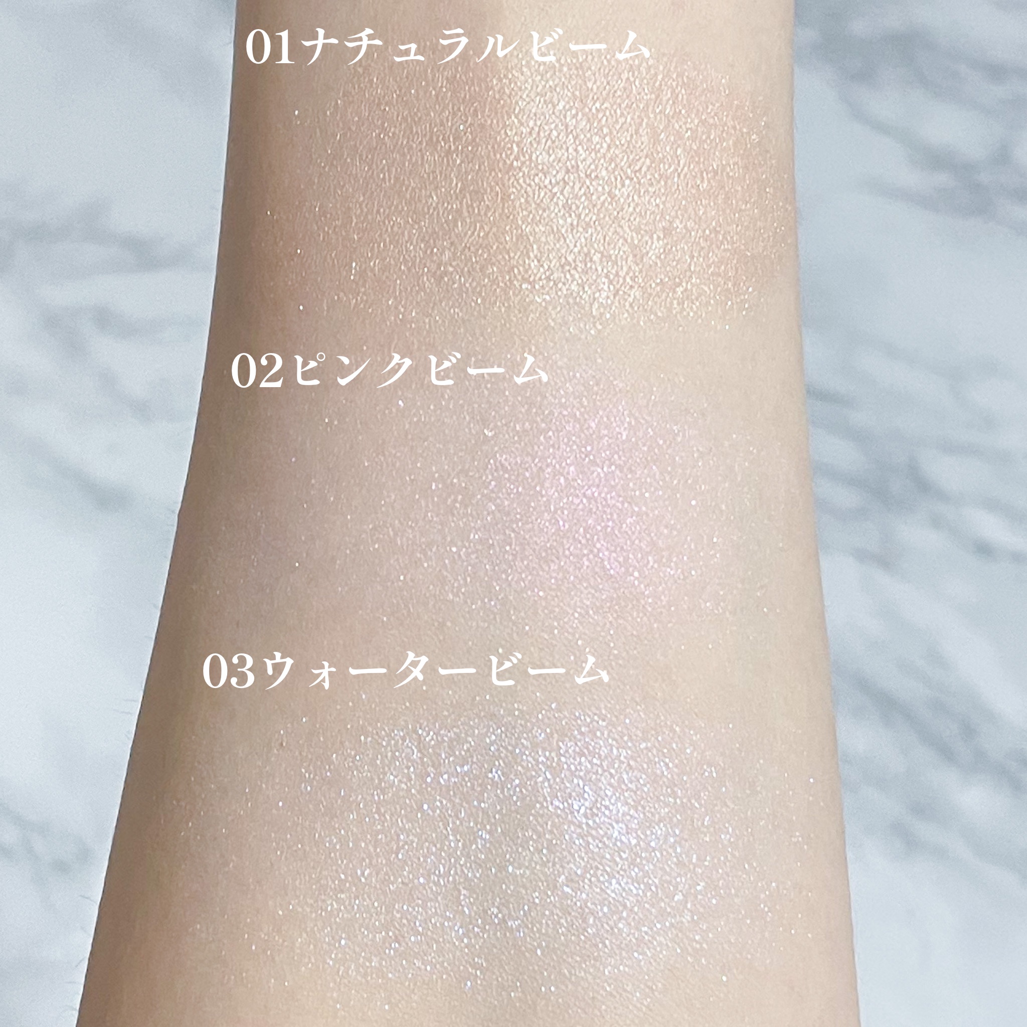 - <01 ナチュラルビーム> 合成フルオロフロゴパイト、(HDI/トリメチロールヘキシルラクトン)クロスポリマー、シリカ、ジメチコン、ナイロン-12、ポリメチルシルセスキオキサン、グリセリン、ペンチレングリコール、トリエトキシカプリリルシラン、ケイ酸(Al/Mg)、ミリスチン酸Mg、ポリソルベート20、(アクリル酸Na/アクリロイルジメチルタウリンNa)コポリマー、デヒドロ酢酸Na、(ビニルジメチコン/メチコンシルセスキオキサン)クロスポリマー、オリーブ油脂肪酸ソルビタン、ステアリン酸ソルビタン、イソヘキサデカン、エチルヘキシルグリセリン、ポリソルベート80、オレイン酸ソルビタン、トコフェロール、酸化チタン、マイカ、酸化鉄 <02 ピンクビーム> 合成フルオロフロゴパイト、ジメチコン、(HDI/トリメチロールヘキシルラクトン)クロスポリマー、ホウケイ酸(Ca/チタン)、ポリメチルシルセスキオキサン、シリカ、ナイロン-12、グリセリン、ペンチレングリコール、ミリスチン酸Mg、ポリソルベート20、酸化スズ、(アクリル酸Na/アクリロイルジメチルタウリンNa)コポリマー、デヒドロ酢酸Na、トリエトキシカプリリルシラン、ケイ酸(Al/Mg)、(ビニルジメチコン/メチコンシルセスキオキサン)クロスポリマー、オリーブ油脂肪酸ソルビタン、ステアリン酸ソルビタン、イソヘキサデカン、エチルヘキシルグリセリン、ポリソルベート80、オレイン酸ソルビタン、トコフェロール、酸化チタン、マイカ、グンジョウ、カオリン、酸化鉄、赤226 <03 ウォータービーム> 合成フルオロフロゴパイト、ジメチコン、(HDI/トリメチロールヘキシルラクトン)クロスポリマー、ホウケイ酸(Ca/チタン)、ポリメチルシルセスキオキサン、ナイロン-12、グリセリン、ペンチレングリコール、ミリスチン酸Mg、ポリソルベート20、酸化スズ、(アクリル酸Na/アクリロイルジメチルタウリンNa)コポリマー、トリエトキシカプリリルシラン、デヒドロ酢酸Na、ケイ酸(Al/Mg)、シリカ、(ビニルジメチコン/メチコンシルセスキオキサン)クロスポリマー、オリーブ油脂肪酸ソルビタン、ステアリン酸ソルビタン、イソヘキサデカン、エチルヘキシルグリセリン、ポリソルベート80、オレイン酸ソルビタン、加水分解ヒアルロン酸、トコフェロール、ローマカミツレ花エキス、酸化チタン、マイカ、グンジョウ、赤226