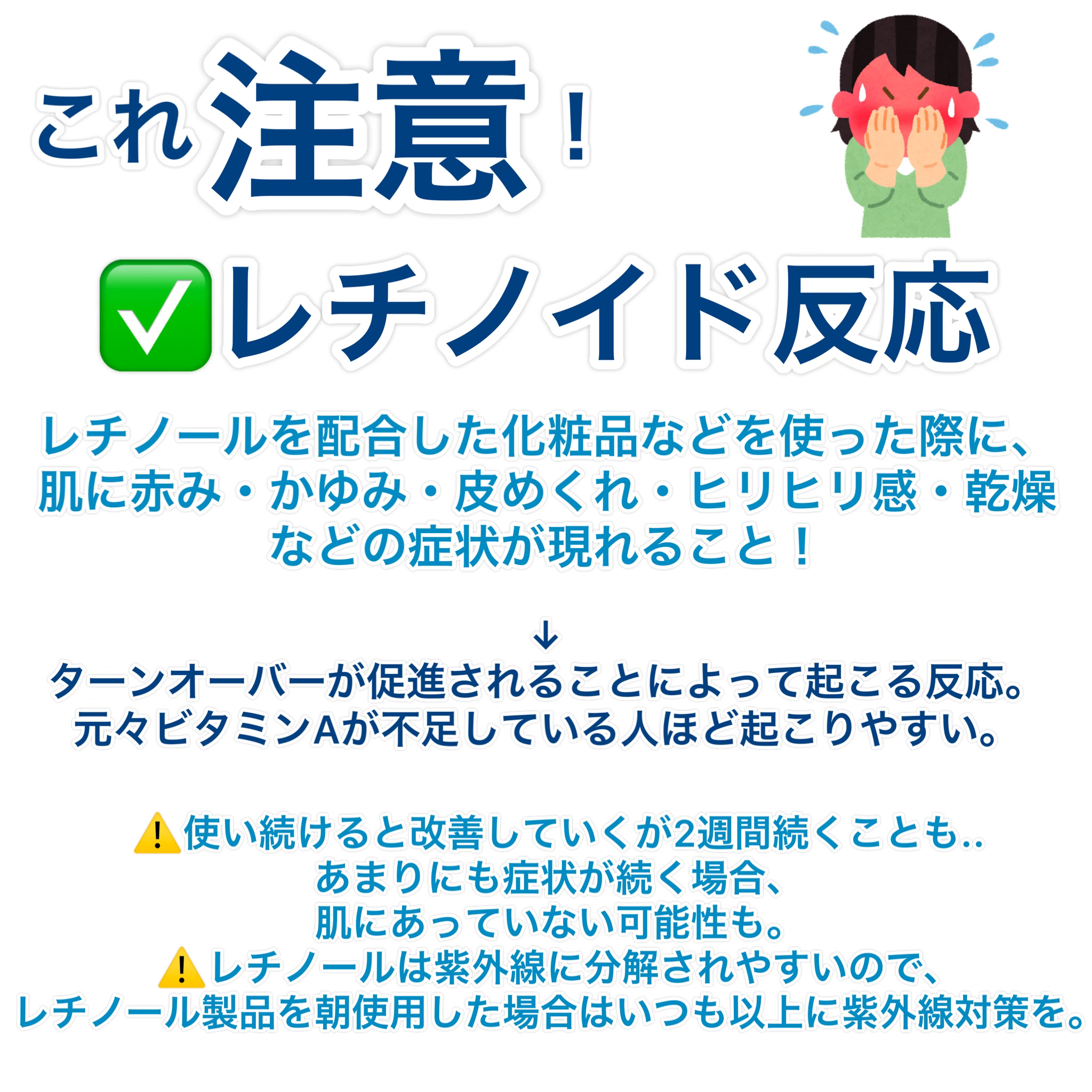 投稿ではレチノールの入った美容液やクリームについて紹介しました!・VTシカレチAエッセンス0.1・VTシカレチAクリーム0.05・innisfreeレチノール シカ リペア セラムレチノールの注意点・低濃度、小量から始めること!(レチノイド反...