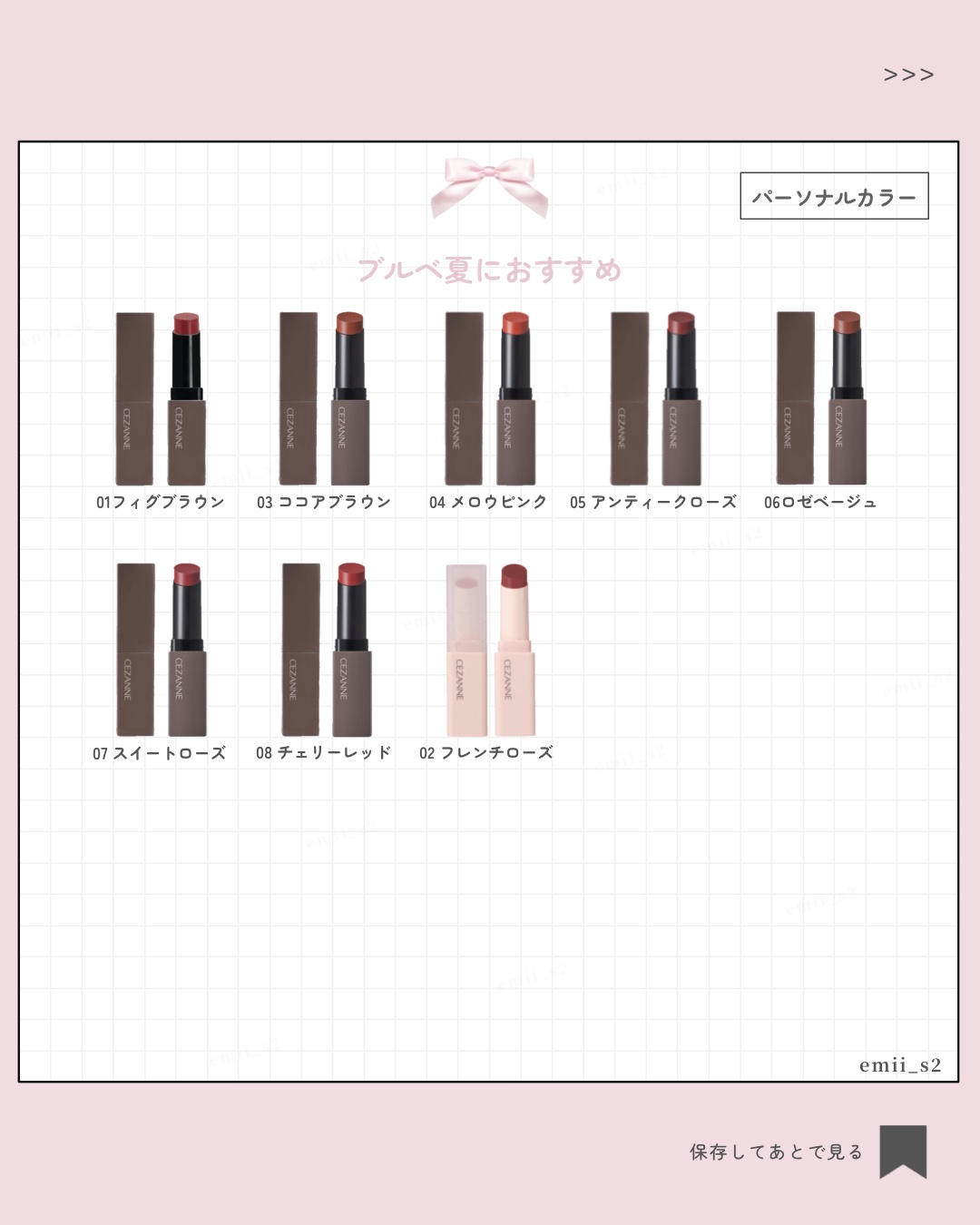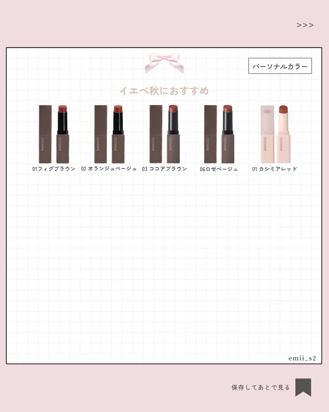 セザンヌリップカラーシールド全色レビューバームのようにするする塗れてシアーに発色、つけたての色艶が持続する高密着のジェル膜リップ💄パーソナルカラー別に分けてはいますが全体的に淡く透け感があるので幅広い方が使いやすいですよ🕊01フィグブラウン(...