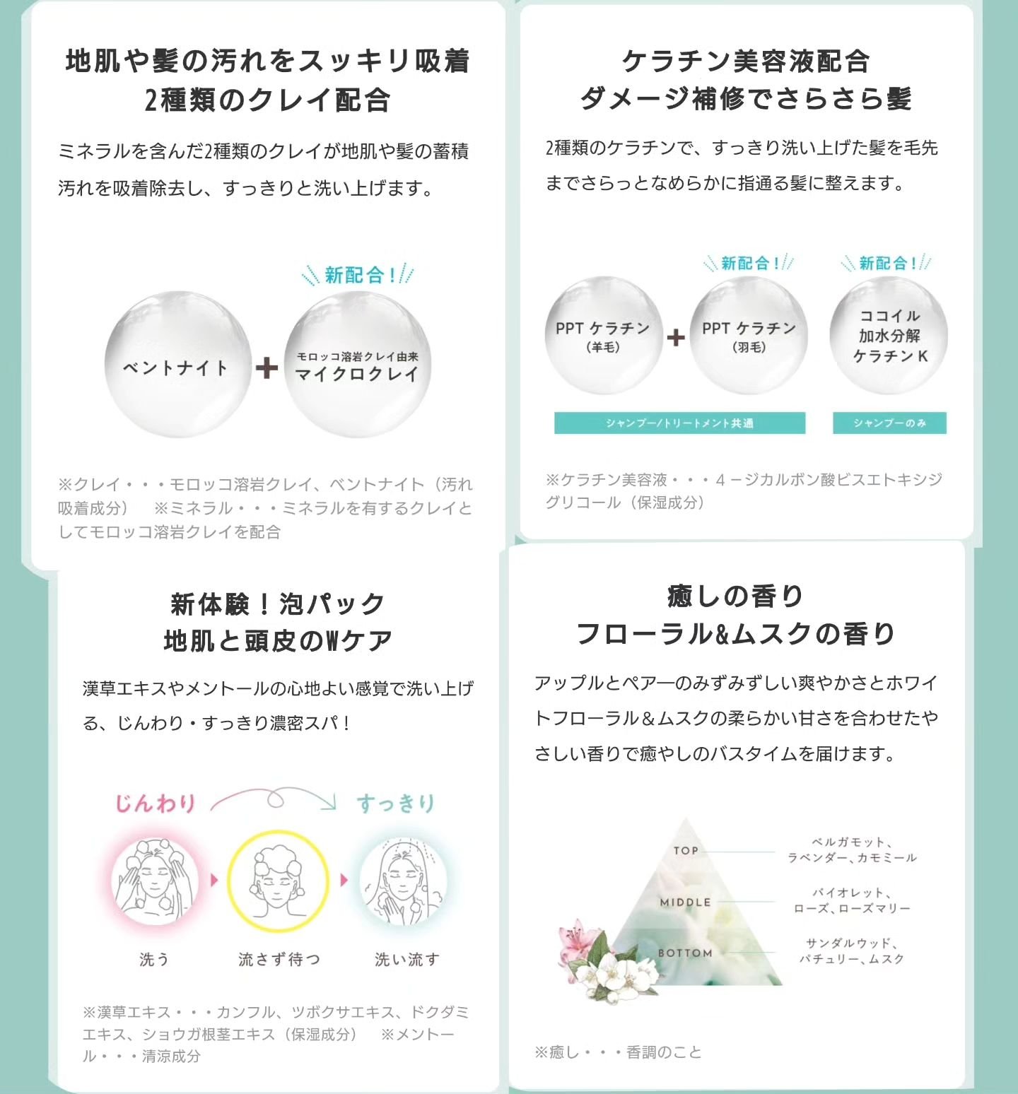 - 海泥(クレイ)配合で地肌の汚れや皮脂を吸着除去し、地肌ケアしながらうるおいを与えてさらっと心地よくなめらかに洗い上げる実感型スパシャンプー&トリートメント。 リラックスしたい日には、シャンプーの際にしばらく地肌をマッサージしながら“泡パック”してから流すと、植物由来の保湿成分が地肌を柔らげてスッキリ引き締めてヘッドスパしたような感覚で地肌環境をすっきり整えます。 上品でさわやかな癒しのフローラルムスクの香り。 ※2023年秋にパッケージリニューアル&補修・美容成分をアップグレード 2023/10/15~ 一部先行発売