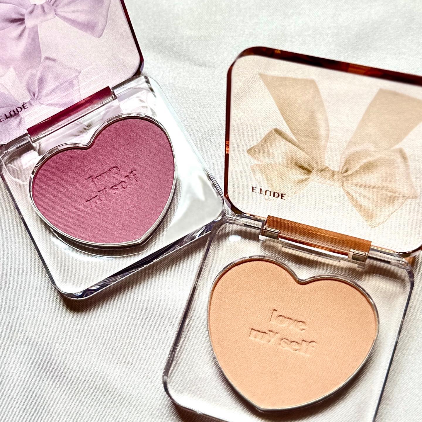 エチュードハートポップブラッシャー透け感で発光あるツヤが可愛い🥰全体に薄くオーロラシャンデリア塗ってその周りをシャルウィーダンスでぼかす感じに塗ったらふんわり感増す☺︎最後にオーロラシャンデリアを真ん中だけにハートマークっぽく🫰🏻◀濃い...