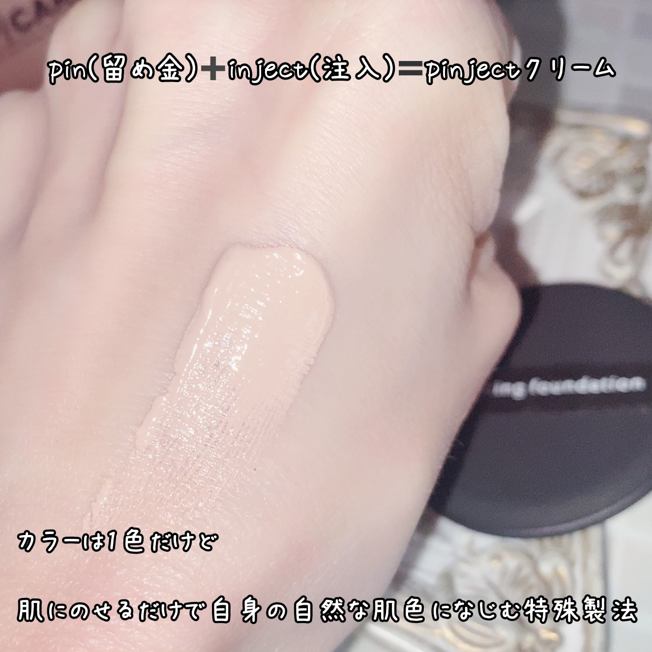 カラーが一色だけなんだけど、なぜか自然に馴染んで全然塗ってる感なく、でも綺麗にカバーしてくれる不思議なファンデ♡ 上品なツヤ感がでて、マスクしてても夜まで綺麗🥰 押すと出てくるタイプだから最後まで衛生的に使えそうなところも好き🫶🏻