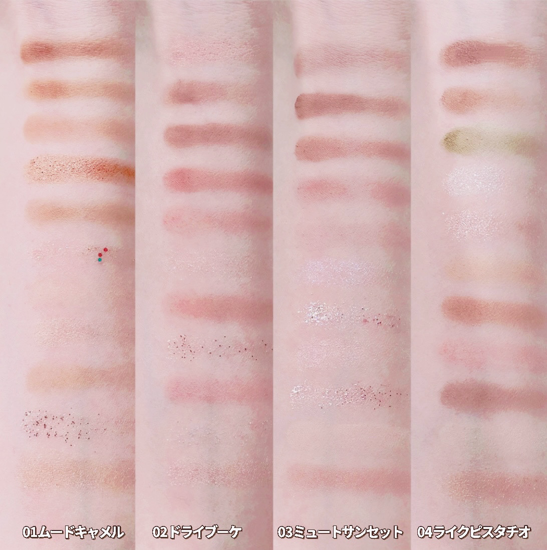 - <02 ドライブーケ> マイカ、タルク、ホウケイ酸(Ca/Al)、マンガンバイオレット、ポリブチレンテレフタレート、パルミチン酸エチルヘキシル、シリカ、ステアリン酸Mg、合成フルオロフロゴパイト、トリメリト酸トリトリデシル、ジメチコン、ポリイソブテン、酸化鉄、酸化チタン、コーンスターチ、ケイ酸(Na/K/Al)、フェノキシエタノール、ヒマワリ種子油、アクリレーツコポリマー、マイクロクリスタリンワックス、トリ(カプリル酸/カプリン酸)グリセリル、PEG-10ジメチコン、(エチレン/VA)コポリマー、ポリブテン、(スチレン/ブタジエン)コポリマー、酸化スズ、メチルパラベン、エチルパラベン、赤201、カプリリルグリコール、ミネラルオイル、Al、メトキシケイヒ酸エチルヘキシル、赤202、黄4 <03 ミュートサンセット> マイカ、タルク、ホウケイ酸(Ca/Al)、ポリブチレンテレフタレート、シリカ、パルミチン酸エチルヘキシル、マンガンバイオレット、トリメリト酸トリトリデシル、ステアリン酸Mg、合成フルオロフロゴパイト、酸化チタン、ポリイソブテン、酸化鉄、ジメチコン、ケイ酸(Na/K/Al)、フェノキシエタノール、コーンスターチ、ヒマワリ種子油、マイクロクリスタリンワックス、トリ(カプリル酸/カプリン酸)グリセリル、アクリレーツコポリマー、PEG-10ジメチコン、ポリブテン、(エチレン/VA)コポリマー、(スチレン/ブタジエン)コポリマー、酸化スズ、メチルパラベン、エチルパラベン、ミネラルオイル、カプリリルグリコール、Al、メトキシケイヒ酸エチルヘキシル、赤201、赤202 <04 ライクピスタチオ> マイカ、タルク、シリカ、合成フルオロフロゴパイト、ホウケイ酸(Ca/Al)、酸化鉄、ステアリン酸Mg、トリメリト酸トリトリデシル、パルミチン酸エチルヘキシル、マンガンバイオレット、ジメチコン、ケイ酸(Na/K/Al)、酸化チタン、PEG-10ジメチコン、コーンスターチ、フェノキシエタノール、ポリブテン、メチルパラベン、エチルパラベン、青1、ミネラルオイル、酸化スズ、赤201