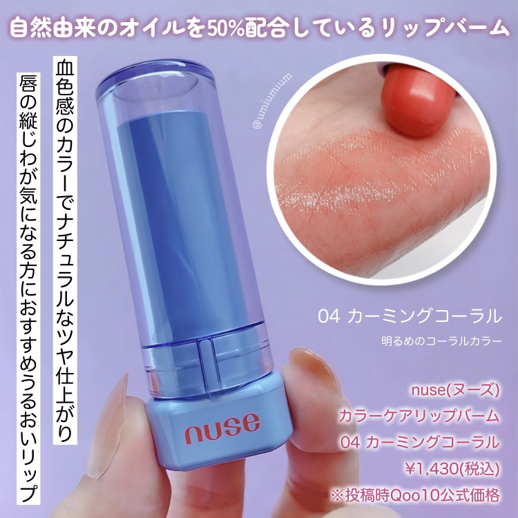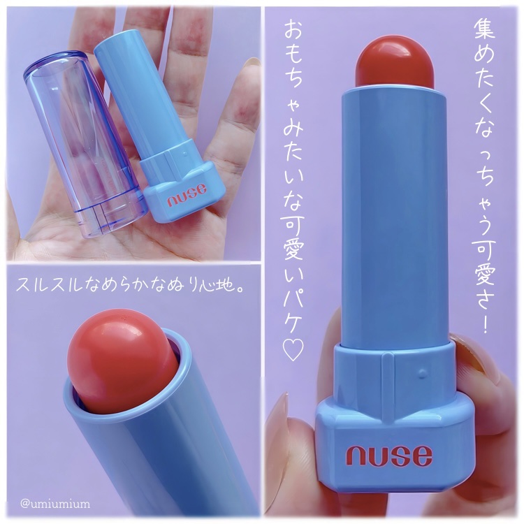 ブルベさんにぴったりな青みがかったピンクで、とっても可愛い色を見つけたので、レビューしていきたいと思います nuseのケアリップチュアルは、ツヤ感があり、透明感のあるティント 9色のカラバリがあるので、好みの色味を選ぶことができます