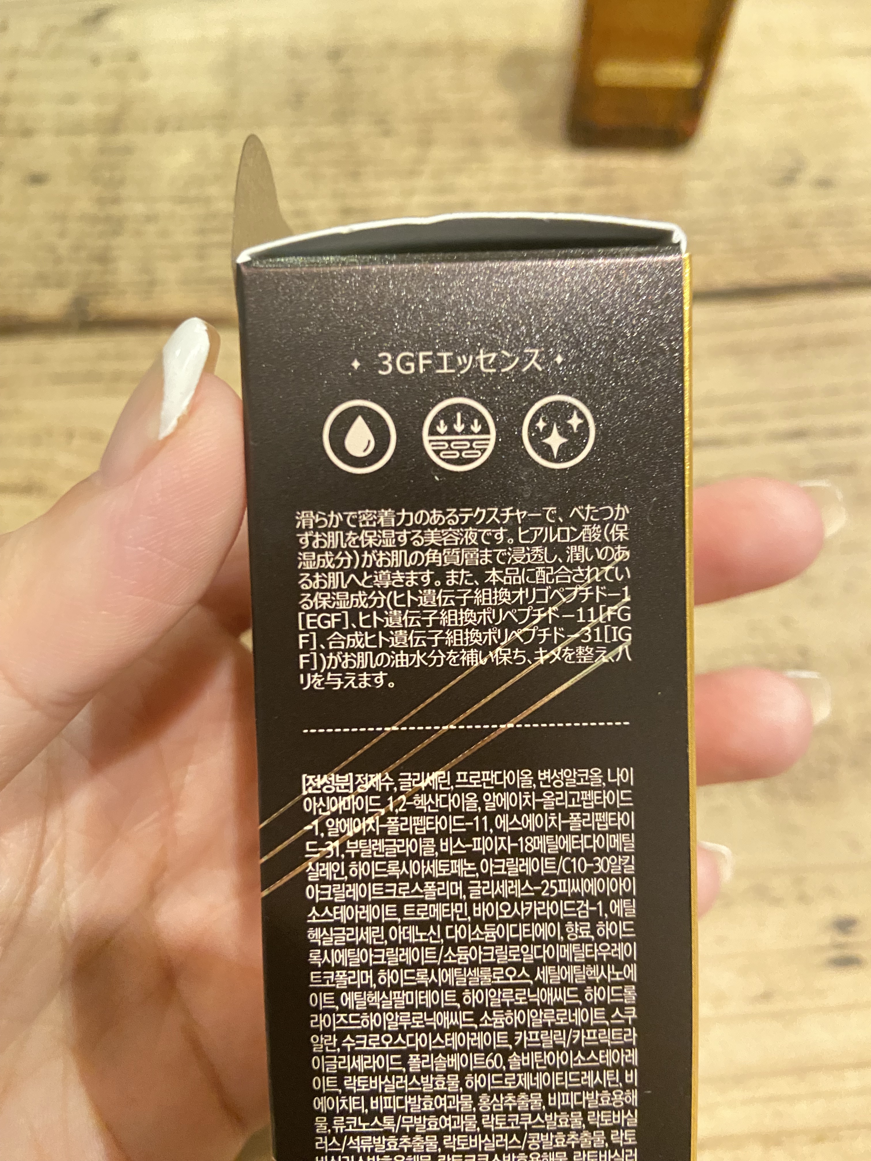 - <100ml> 水、グリセリン、プロパンジオール、変性アルコール、ナイアシンアミド、1,2-ヘキサンジオール、ヒト遺伝子組換 オリゴペプチド-1、ヒト遺伝子組換ポリペプチド-11、合成ヒト遺伝子組換ポリペプチド-31、BG、ビスPEG -18メチルエーテルジメチルシラン、ヒドロキシアセトフェノン、(アクリレーツ/アクリル酸アルキル(C10-3 0))クロスポリマー、(PCA/イソステアリン酸)グリセレス-25、トロメタミン、ビオサッカリドガム-1、エ チルヘキシルグリセリン、アデノシン、EDTA-2Na、香料、(アクリル酸ヒドロキシエチル/アクリロイルジメチ ルタウリンNa)コポリマー、ヒドロキシエチルセルロース、エチルヘキサン酸セチル、パルミチン酸エチルヘキシル、ヒアルロン酸、加水分解ヒアルロン酸、ヒアルロン酸Na、スクワラン、ジステアリン酸スクロース、トリ(カプリル酸 /カプリン酸)グリセリル、ポリソルベート60、イソステアリン酸ソルビタン、乳酸桿菌発酵液、水添レシチン、BH T、ビフィズス菌培養液、オタネニンジン根エキス、ビフィズス菌培養溶解質、レウコノストック/ダイコン根発酵液、乳酸球菌培養液、乳酸桿菌/ザクロ果実発酵エキス、乳酸桿菌/ダイズ発酵エキス、乳酸桿菌培養溶解質、乳酸球菌培養 溶解質、アセロラチェリー発酵液、アラントイン、マルトデキストリン <30ml> 水、グリセリン、プロパンジオール、変性アルコール、ナイアシンアミド、1,2-ヘキサンジオール、ヒト遺伝子組換 オリゴペプチド-1、ヒト遺伝子組換ポリペプチド-11、合成ヒト遺伝子組換ポリペプチド-31、BG、ビスPEG -18メチルエーテルジメチルシラン、ヒドロキシアセトフェノン、(アクリレーツ/アクリル酸アルキル(C10-3 0))クロスポリマー、(PCA/イソステアリン酸)グリセレス-25、トロメタミン、ビオサッカリドガム-1、エ チルヘキシルグリセリン、アデノシン、EDTA-2Na、香料、(アクリル酸ヒドロキシエチル/アクリロイルジメチ ルタウリンNa)コポリマー、ヒドロキシエチルセルロース、エチルヘキサン酸セチル、パルミチン酸エチルヘキシル、ヒアルロン酸、加水分解ヒアルロン酸、ヒアルロン酸Na、スクワラン、ジステアリン酸スクロース、トリ(カプリル酸 /カプリン酸)グリセリル、ポリソルベート60、イソステアリン酸ソルビタン、乳酸桿菌発酵液、水添レシチン、BH T、ビフィズス菌培養液、オタネニンジン根エキス、ビフィズス菌培養溶解質、レウコノストック/ダイコン根発酵液、乳酸球菌培養液、乳酸桿菌/ザクロ果実発酵エキス、乳酸桿菌/ダイズ発酵エキス、乳酸桿菌培養溶解質、乳酸球菌培養 溶解質、アセロラチェリー発酵液、アラントイン、マルトデキストリン