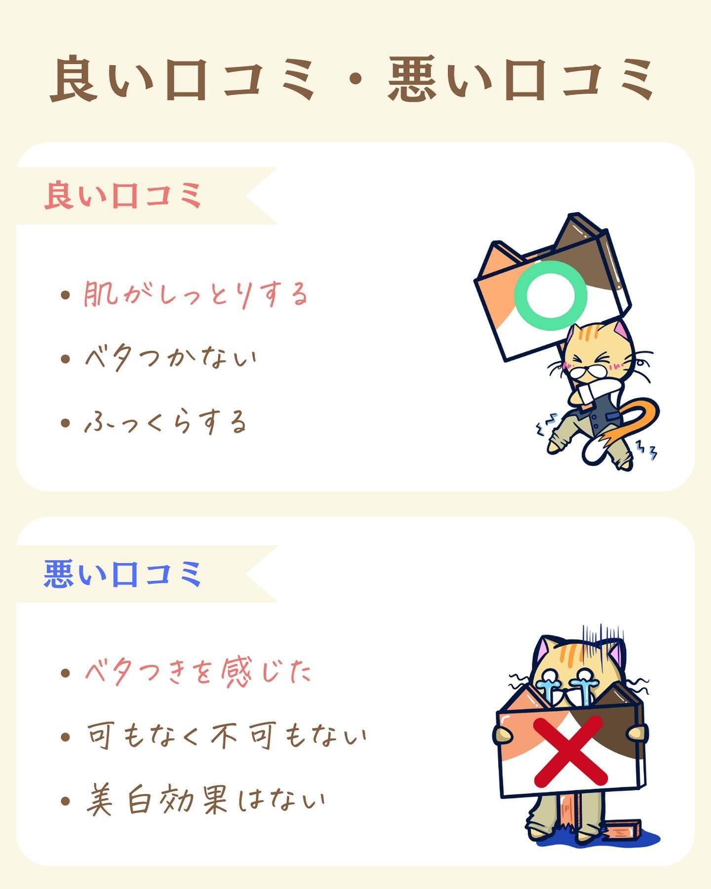 腕に塗布してから30分経過した肌水分量の平均増加率は+87%と優秀すぎる保湿力 サラッとした仕上がり DPG配合 美白有効成分のホワイトトラネキサム酸や、追加された肌荒れ防止有効成分のアラントインが配合 ぬるぬる感は強め 少ししっとりした仕上がりでしっとりタイプの乳液を塗ったような保湿力 有効成分のナイアシンアミドが配合 うるおい成分として3種類のヒアルロン酸が配合