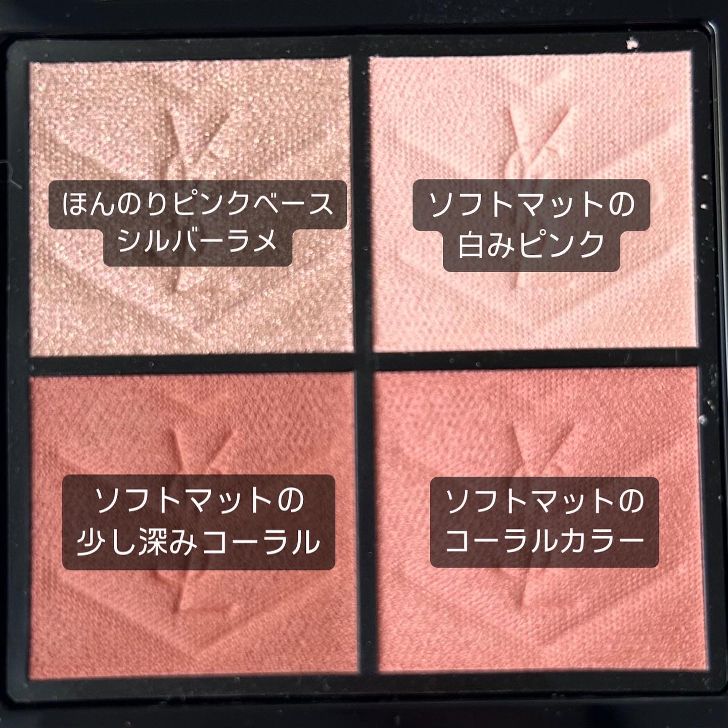 暖かみのあるソフトピーチ🍑 しっとりとしたテクスチャー。肌に密着しているように感じ、粉飛びは気になりませんでした。 左上ラメ ベージュブラウンにピンクとゴールドラメがキラキラして可愛い🫶 全体的にあたたかみのある色なので、イエベが得意な色かなと思いました。