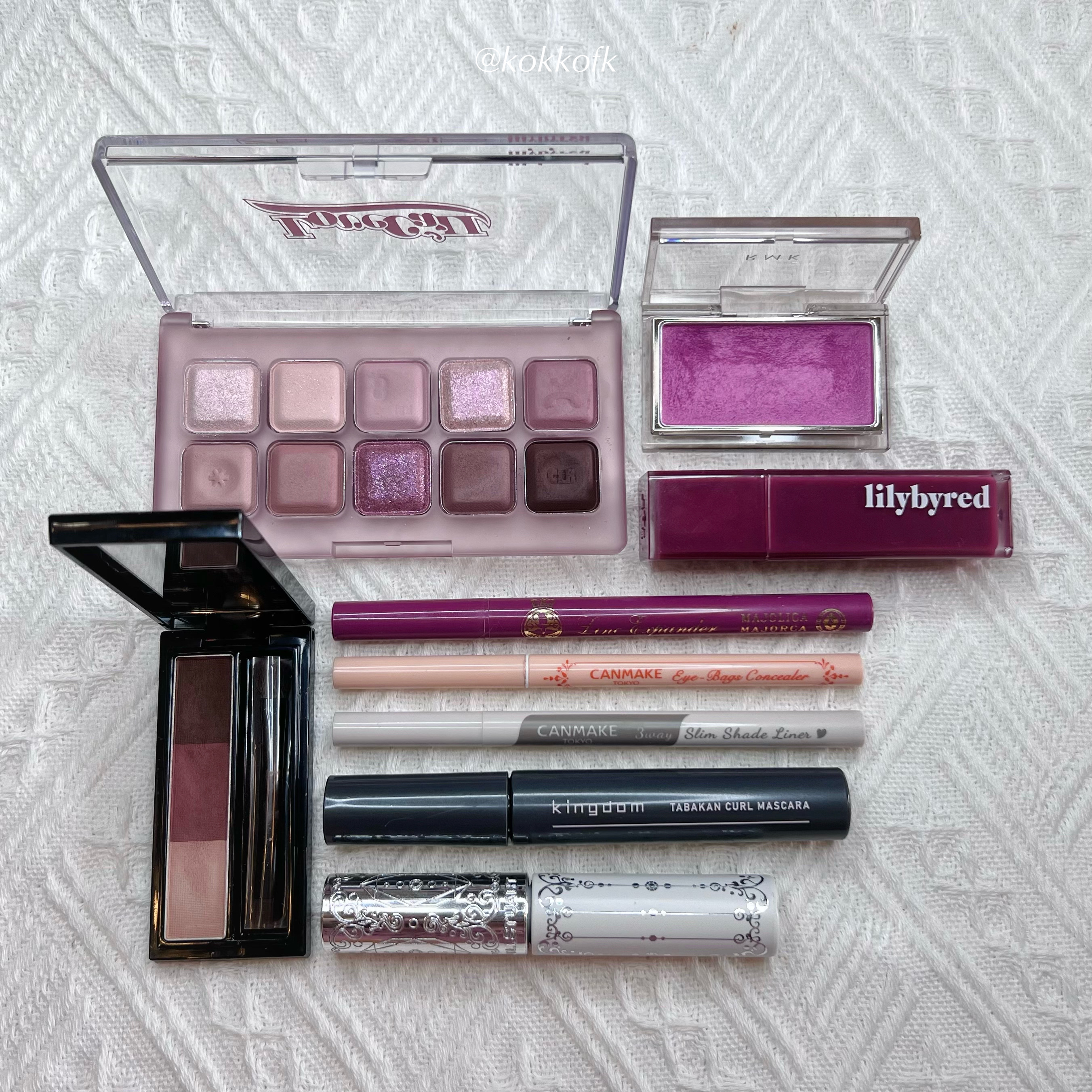 W デイリームードアップパレット01 ソフトモーブピンク (¥2420) プロ アイ パレット13 PICNIC BY THE SUNSET, グラムチェンジマルチパレット04 ユニコーンピンク (¥1890) グリッターぺディアアイパレットN°4 オールラベンダーフォグ (¥2950) シャドウパレット16 バイオレットニット (¥3610) ベターザンパレット06 PEONY NUDE GARDEN, 09 DREAMY LILAC GARDEN (¥2900)