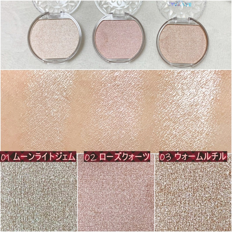 - <01 ムーンライトジェム> トリエチルヘキサノイン、合成フルオロフロゴパイト、ジメチコン、リンゴ酸ジイソステアリル、(ジメチコン/ビニルジメチコン)クロスポリマー、シリカ、スクワラン、オリーブ果実油、セラミドNP、ホホバ種子油、カニナバラ果実油、パルミチン酸レチノール、ツボクサ葉エキス、BG、マイクロクリスタリンワックス、パラフィン、トコフェロール、フェノキシエタノール、メチルパラベン、ジパルミチン酸アスコルビル、酸化チタン、酸化鉄、水酸化Al、酸化スズ <02 ローズクォーツ> トリエチルヘキサノイン、合成フルオロフロゴパイト、ジメチコン、リンゴ酸ジイソステアリル、(ジメチコン/ビニルジメチコン)クロスポリマー、シリカ、スクワラン、オリーブ果実油、セラミドNP、ホホバ種子油、カニナバラ果実油、パルミチン酸レチノール、ツボクサ葉エキス、BG、マイクロクリスタリンワックス、パラフィン、トコフェロール、フェノキシエタノール、メチルパラベン、ジパルミチン酸アスコルビル、マイカ、酸化チタン、酸化鉄、赤202、水酸化Al、酸化スズ <03 ウォームルチル> トリエチルヘキサノイン、ジメチコン、合成フルオロフロゴパイト、リンゴ酸ジイソステアリル、(ジメチコン/ビニルジメチコン)クロスポリマー、シリカ、スクワラン、オリーブ果実油、セラミドNP、ホホバ種子油、カニナバラ果実油、パルミチン酸レチノール、ツボクサ葉エキス、BG、マイクロクリスタリンワックス、パラフィン、トコフェロール、フェノキシエタノール、メチルパラベン、ジパルミチン酸アスコルビル、マイカ、酸化チタン、酸化鉄、水酸化Al、酸化スズ <04 ブルートパーズ> トリエチルヘキサノイン、ジメチコン、合成フルオロフロゴパイト、リンゴ酸ジイソステアリル、(ジメチコン/ビニルジメチコン)クロスポリマー、シリカ、スクワラン、オリーブ果実油、セラミドNP、ホホバ種子油、カニナバラ果実油、パルミチン酸レチノール、ツボクサ葉エキス、BG、マイクロクリスタリンワックス、パラフィン、トコフェロール、フェノキシエタノール、メチルパラベン、ジパルミチン酸アスコルビル、マイカ、酸化チタン、コンジョウ、グンジョウ、水酸化Al、酸化スズ