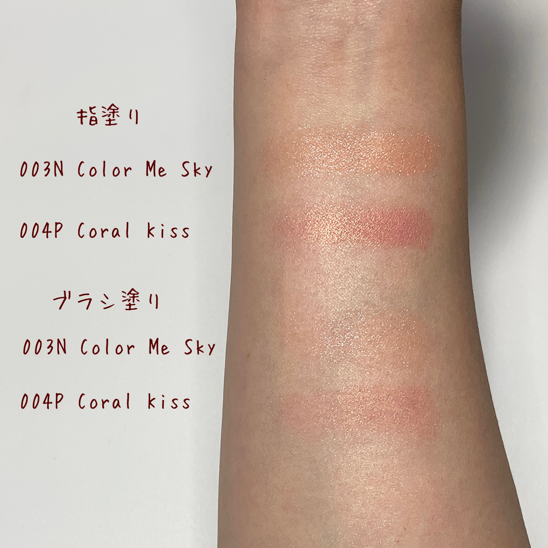元々使ってるColor Me Skyに似てるかな?と思ったけど 実際つけてみると全然ちがって!! Coral Kissの方がザ・ピンクって感じで ゴールドラメがキラキラしてかわいい💓 Color Me Skyはニュアンサーなだけ合って透け感があり、ラメも多色ラメって感じでキラキラしてます!