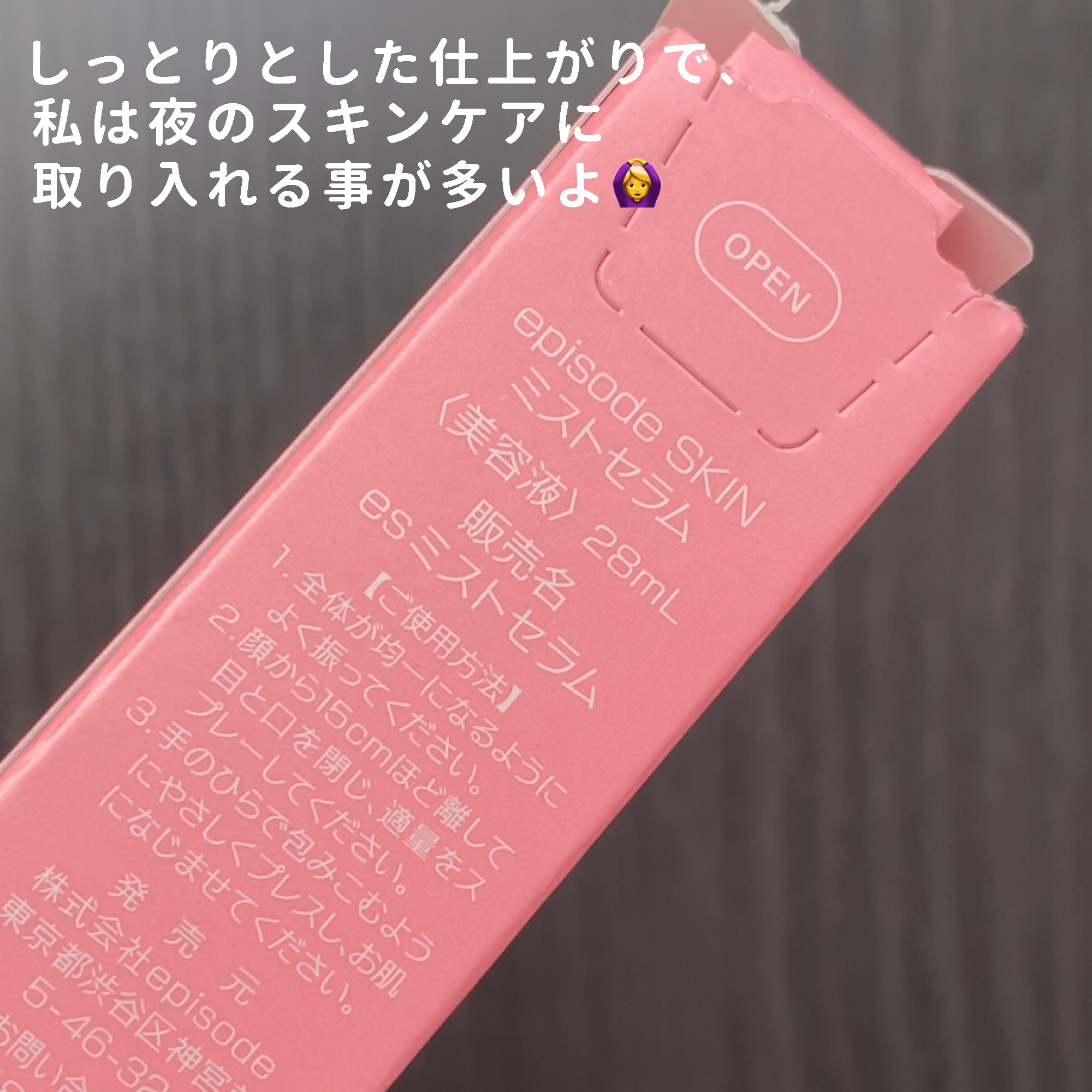 - 須田アンナとYURINOがプロデュースするスキンケアブランド「episode SKIN/エピソードスキン」から第一弾として”ミストセラム”を発売! 様々な肌悩みの原因である乾燥からお肌を守る「保湿」ケアがいつでもどこでも簡単時短にできるミストタイプの美容液です。成分へのこだわりはもちろんのこと、どこにでも持ち歩きたくなるようなお洒落なパッケージにデザインしました。