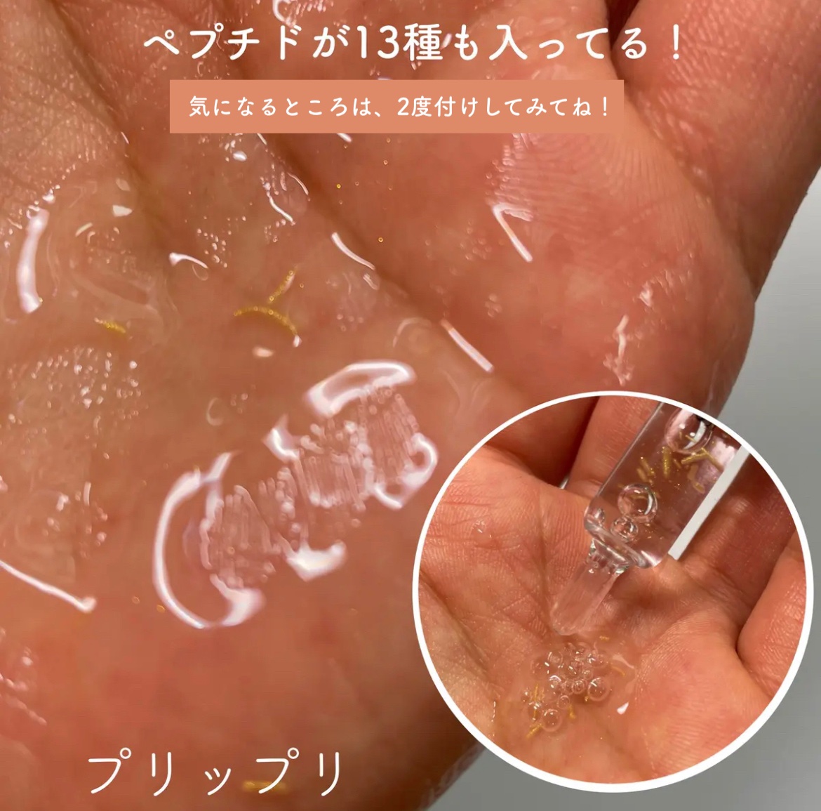 - <35mL> 水、BG、グリセリン、メチルプロパンジオール、1,2-ヘキサンジオール、ナイアシンアミド、カルボマー、トロメタン、PPG-13デシルテトラデセス-24、ヒドロキシエチルセルロース、シルクエキス、アデノシン、トチャカ、カンテン、エチルヘキシルグリセリン、EDTA-2Na、(アクリルレート/アクリル酸アルキル(C10-30))クロスポリマー、合成フルオトフロゴバイト、ベタイン、パンテノール、加水分解エラスチン、酸化チタン、赤色酸化鉄、マイカ、ジェランガム、加水分解コラーゲンエキス、ツボクサエキス、プロパンジオール、リン酸アスコルビルMg、ドクダミエキス、レシチン、アセチルグルタミン、フェノキシエタノール、カワラヨモギエキス、ヒアルロン酸Na、カプリリルグリコール、酸化スズ、金、スクワラン、水添ポリイソブテン、ベンジルグリコール、合成ヒト遺伝子組換オリゴペプチド-1、合成ヒト遺伝子組換ポリペプチド-1、合成ヒト遺伝子組換オリゴペプチド-2、合成ヒト遺伝子組換ポリペプチド-11、合成ヒト遺伝子組換オリゴペプチド-9、加水分解ムコ多糖、コラーゲン、トコフェロール、ヒアルロン酸クロスポリマーNa、加水分解ヒアルロン酸、合成ヒト遺伝子組換デカペプチド-7、合成ヒトオクタペプチド-4、合成ヒトペンタペプチド-19、ヒアルロン酸ヒドロキシプロピルトリモニウム、バルミトイルペンタペプチド-4、アセチルヘキサペプチド-8、トリペプチド-1、銅、ヒアルロン酸、ハナスゲ根エキス、アセチルヒアルロン酸Na、ラズベリーケトン