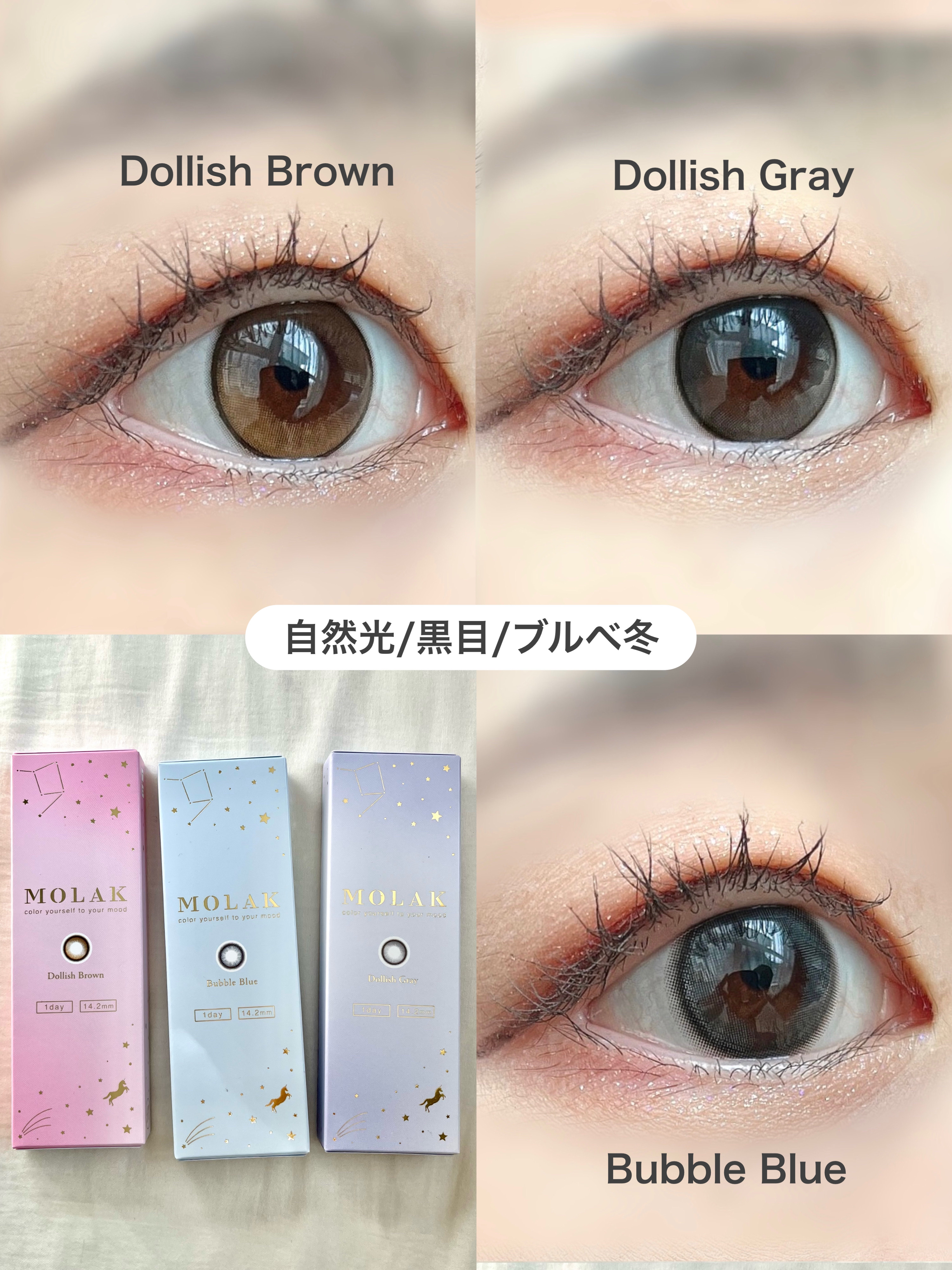 MOLAKの乱視用レンズに新色が仲間入り! ▶︎ドーリッシュブラウン TORIC DIA14.2mm GDIA13.2mm ハイライト入りの水光グラデーションのカラコン。ちゅるんとしたデザインで、ナチュラルに瞳に馴染んでくれます。 ▶︎ダズルグレー TORIC DIA14.2mm GDIA12.8mm ダークグレーのカラコンで、こちらも瞳に馴染みやすいデザイン。ナチュラルなのでデイリー使いしやすいです◎ 乱視用レンズは下の方に厚みを持たせることで目の中でくるくる回りにくいそうです。なのでドーリッシュブラウンTORICのようにハイライト入りのデザインは特に使いやすいと思います◎