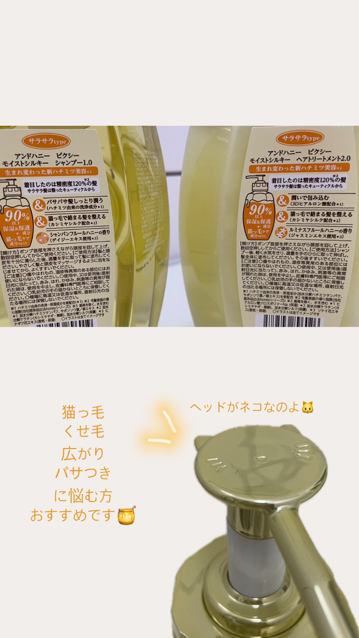 - <シャンプー本体 440ml> 水、ラウラミドプロピルベタイン、オレフィン(C14-16)スルホン酸Na、ココイルメチルタウリンNa、コカミドDEA、ハチミツ、ハチミツエキス、加水分解ハチミツタンパク、プロポリスエキス、ローヤルゼリーエキス、アルガニアスピノサ核油、加水分解ケラチン(カシミヤヤギ)(羊毛)、加水分解シルク、シア脂、セレブロシド、ヒアルロン酸クロスポリマーNa、ゼイン、ヒナギク花エキス、サボンソウ葉/根エキス、ヤシ油脂肪酸PEG-7グリセリル、EDTA-2Na、ポリクオタニウム-10、ヤシ油アルキルグルコシド、ステアリン酸エチルヘキシル、キサンタンガム、イソステアリン酸Na、(ジイソステアリン酸/ポリヒドロキシステアリン酸/セバシン酸)ポリグリセリル-4、グリセリン、安息香酸Na、クエン酸、黄4、黄5、DPG、BG、フェノキシエタノール、香料 <ヘアトリートメント本体 440g> 水、DPG、セテアリルアルコール、ベヘントリモニウムクロリド、ハチミツ、ハチミツエキス、加水分解ハチミツタンパク、プロポリスエキス、ローヤルゼリーエキス、アルガニアスピノサ核油、加水分解ケラチン(カシミヤヤギ)(羊毛)、加水分解シルク、シア脂、セレブロシド、ヒアルロン酸クロスポリマーNa、ゼイン、ソケイ花エキス、サボンソウ葉/根エキス、ヤシ油アルキルグルコシド、ステアリン酸エチルヘキシル、キサンタンガム、ジメチコン、イソプロパノール、(ジイソステアリン酸/ポリヒドロキシステアリン酸/セバシン酸)ポリグリセリル-4、グリセリン、ペンテト酸5Na、クエン酸、クエン酸Na、黄4、黄5、イソステアリン酸Na、BG、フェノキシエタノール、香料 <シャンプー(つめかえ) 350ml> 水、ラウラミドプロピルベタイン、オレフィン(C14-16)スルホン酸Na、ココイルメチルタウリンNa、コカミドDEA、ハチミツ、ハチミツエキス、加水分解ハチミツタンパク、プロポリスエキス、ローヤルゼリーエキス、アルガニアスピノサ核油、加水分解ケラチン(カシミヤヤギ)(羊毛)、加水分解シルク、シア脂、セレブロシド、ヒアルロン酸クロスポリマーNa、ゼイン、ヒナギク花エキス、サボンソウ葉/根エキス、ヤシ油脂肪酸PEG-7グリセリル、EDTA-2Na、ポリクオタニウム-10、ヤシ油アルキルグルコシド、ステアリン酸エチルヘキシル、キサンタンガム、イソステアリン酸Na、(ジイソステアリン酸/ポリヒドロキシステアリン酸/セバシン酸)ポリグリセリル-4、グリセリン、安息香酸Na、クエン酸、黄4、黄5、DPG、BG、フェノキシエタノール、香料 <ヘアトリートメント(つめかえ) 350g> 水、DPG、セテアリルアルコール、ベヘントリモニウムクロリド、ハチミツ、ハチミツエキス、加水分解ハチミツタンパク、プロポリスエキス、ローヤルゼリーエキス、アルガニアスピノサ核油、加水分解ケラチン(カシミヤヤギ)(羊毛)、加水分解シルク、シア脂、セレブロシド、ヒアルロン酸クロスポリマーNa、ゼイン、ソケイ花エキス、サボンソウ葉/根エキス、ヤシ油アルキルグルコシド、ステアリン酸エチルヘキシル、キサンタンガム、ジメチコン、イソプロパノール、(ジイソステアリン酸/ポリヒドロキシステアリン酸/セバシン酸)ポリグリセリル-4、グリセリン、ペンテト酸5Na、クエン酸、クエン酸Na、黄4、黄5、イソステアリン酸Na、BG、フェノキシエタノール、香料 <ヘアトリートメント詰替え10%増量 385g> 水、DPG、セテアリルアルコール、ベヘントリモニウムクロリド、ハチミツ、ハチミツエキス、加水分解ハチミツタンパク、プロポリスエキス、ローヤルゼリーエキス、アルガニアスピノサ核油、加水分解ケラチン(カシミヤヤギ)(羊毛)、加水分解シルク、シア脂、セレブロシド、ヒアルロン酸クロスポリマーNa、ゼイン、ソケイ花エキス、サボンソウ葉/根エキス、ヤシ油アルキルグルコシド、ステアリン酸エチルヘキシル、キサンタンガム、ジメチコン、イソプロパノール、(ジイソステアリン酸/ポリヒドロキシステアリン酸/セバシン酸)ポリグリセリル-4、グリセリン、ペンテト酸5Na、クエン酸、クエン酸Na、黄4、黄5、イソステアリン酸Na、BG、フェノキシエタノール、香料 <シャンプー詰替え10%増量 385ml> 水、ラウラミドプロピルベタイン、オレフィン(C14-16)スルホン酸Na、ココイルメチルタウリンNa、コカミドDEA、ハチミツ、ハチミツエキス、加水分解ハチミツタンパク、プロポリスエキス、ローヤルゼリーエキス、アルガニアスピノサ核油、加水分解ケラチン(カシミヤヤギ)(羊毛)、加水分解シルク、シア脂、セレブロシド、ヒアルロン酸クロスポリマーNa、ゼイン、ヒナギク花エキス、サボンソウ葉/根エキス、ヤシ油脂肪酸PEG-7グリセリル、EDTA-2Na、ポリクオタニウム-10、ヤシ油アルキルグルコシド、ステアリン酸エチルヘキシル、キサンタンガム、イソステアリン酸Na、(ジイソステアリン酸/ポリヒドロキシステアリン酸/セバシン酸)ポリグリセリル-4、グリセリン、安息香酸Na、クエン酸、黄4、黄5、DPG、BG、フェノキシエタノール、香料