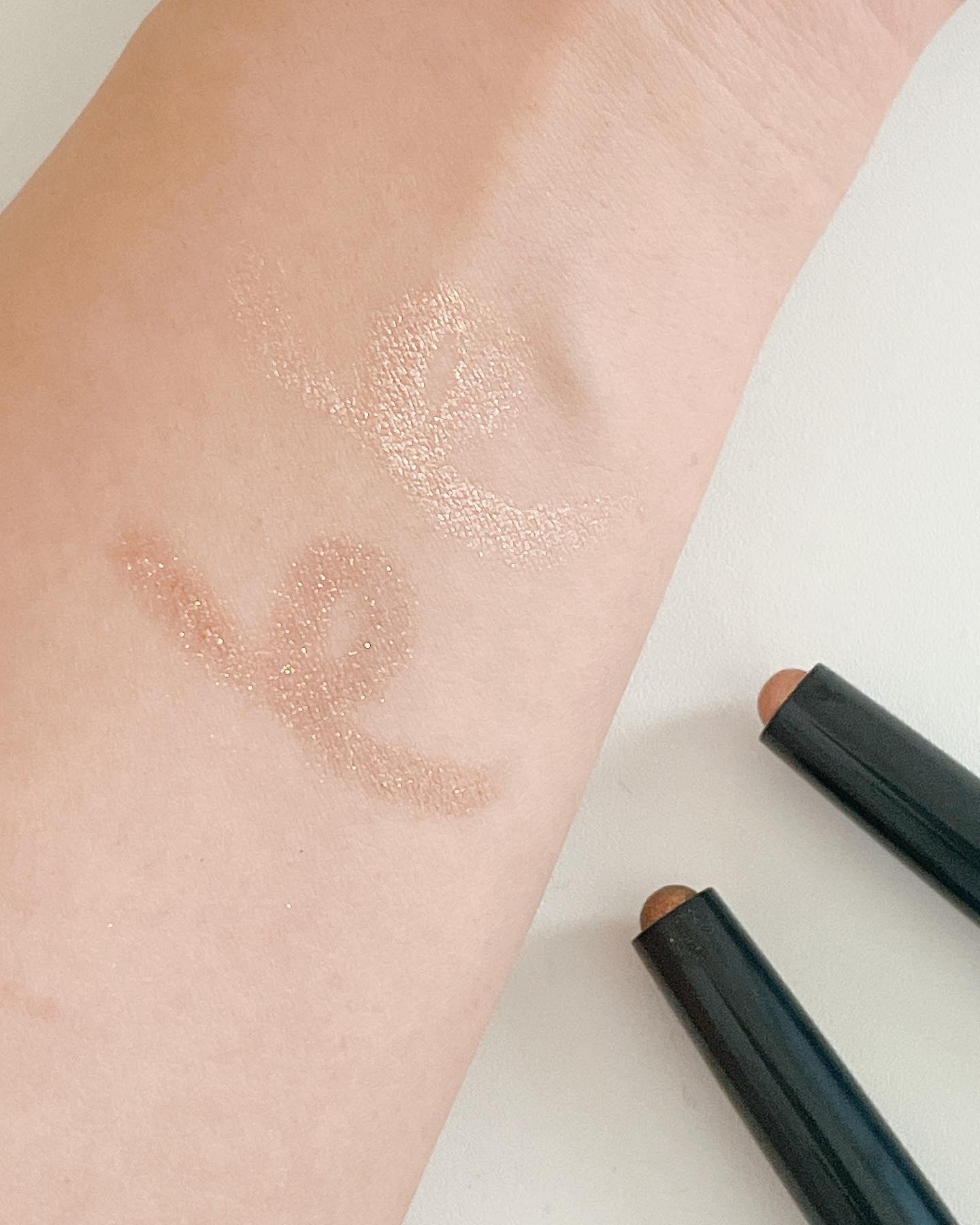 質感:マルチクロム ソフトラベンダー&ペリウィンクル 青ラメが綺麗な淡いカラー カラーよりも質感を楽しむ色味なのでアイメイクにしっかり色味が欲しい場合はスティックアイシャドウを先に際にのせてぼかしてか重ねたり、パウダーアイシャドウと組み合わせるのがオススメ 定着すると崩れにくく擦れにも強いシャドウスティック のせてすぐであればぼかせます
