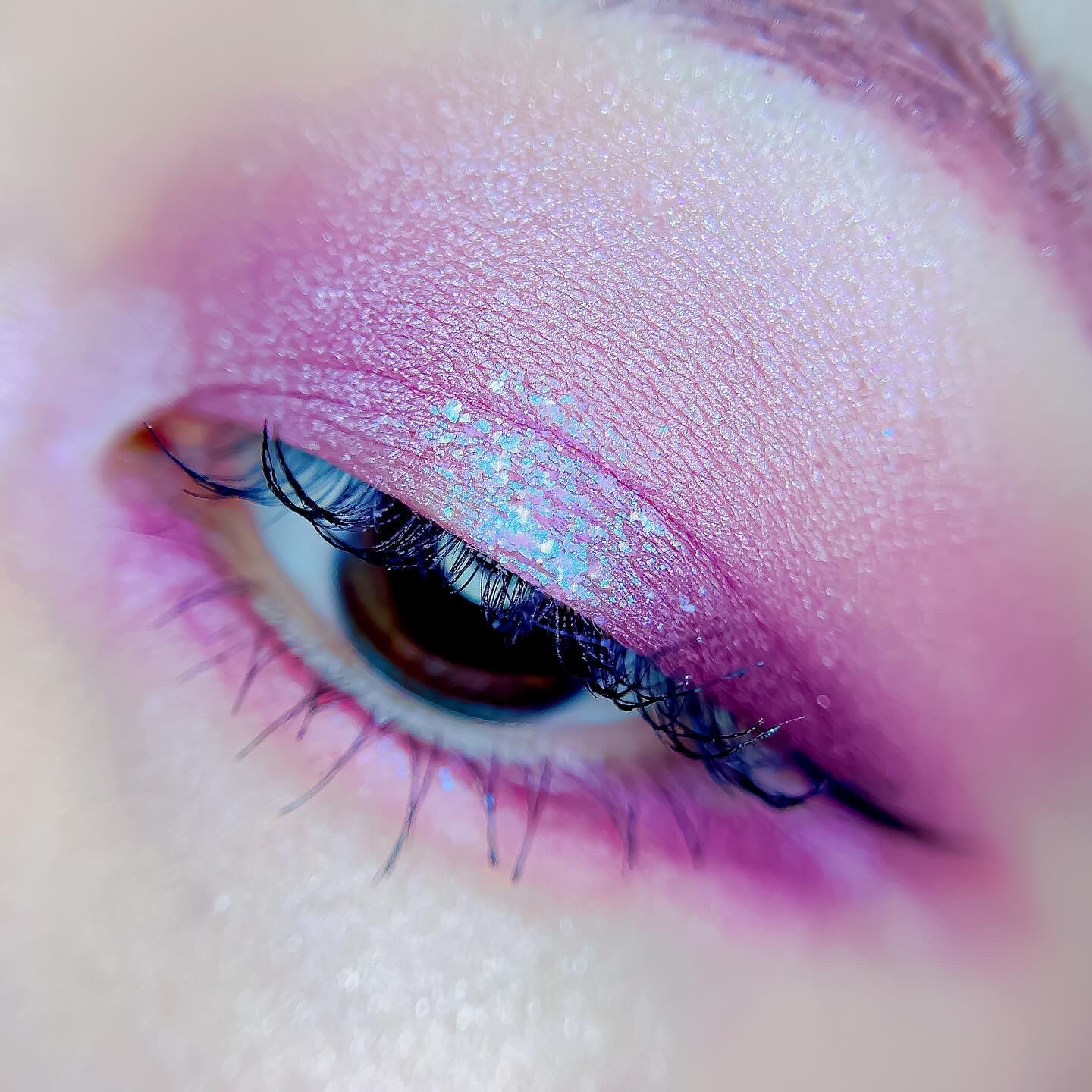 ベースに右上、目頭から黒目上に真ん中、黒目〜目尻に右下を、左上を目頭にくの字に塗ってもらいました✨ ピンクサクラよりもクールな感じで、目で見た色より私の肌では紫っぽく発色しました😍 上2つはラメはぎっしりでときめく💓 ブラウンメイクがとても苦手だけれどこれならブラウンメイク出来そう👌(かなり紫寄りですが) くすみ感は強いので苦手な方は厳しいかも…(特に真ん中) クールな印象になるので大人顔さん向けor大人顔になりたい方向けのイメージです✨