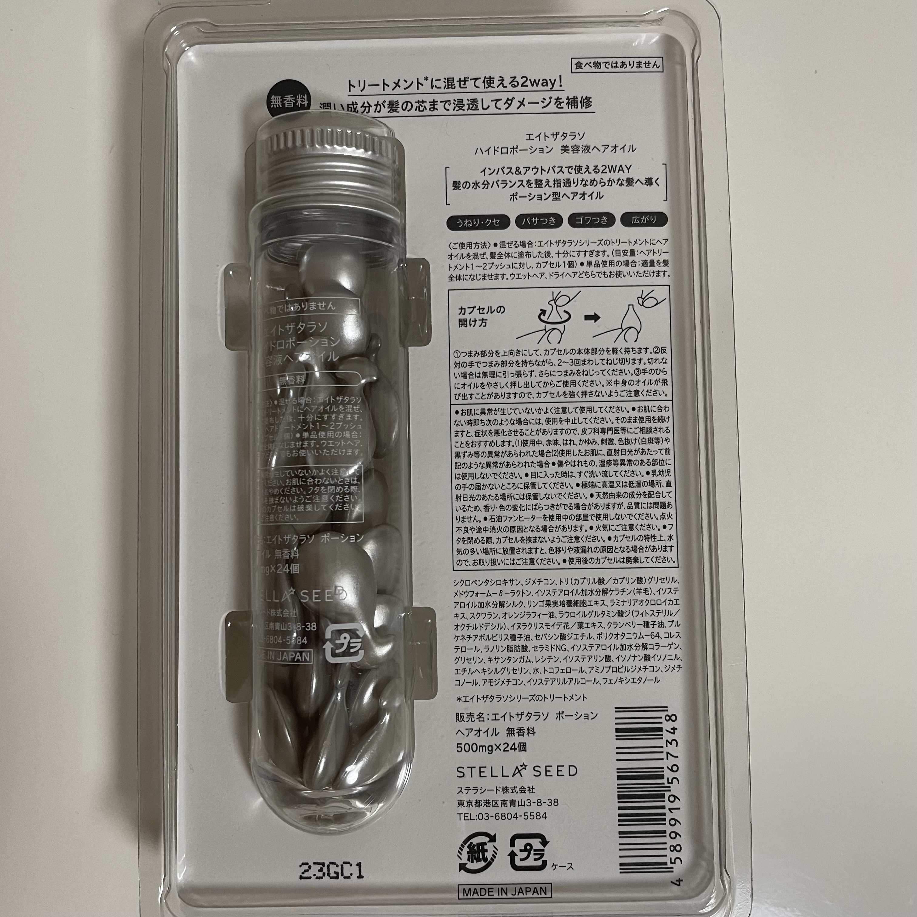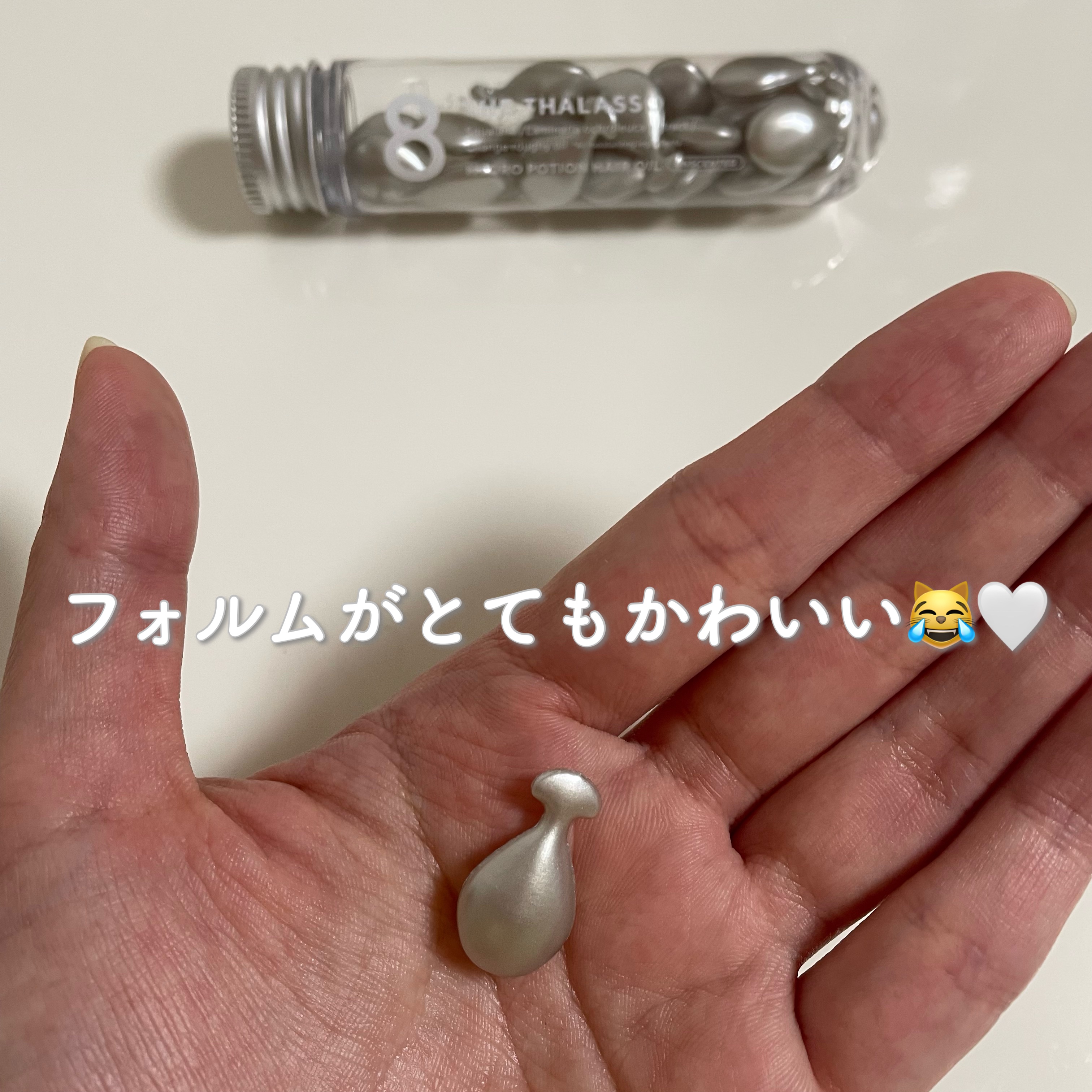 すっかりお気に入りになっているユニセックスで使えるエイトザタラソ ユー。 香りが大好きなのもあってヘアオイルもあったのでこちらもセット購入しておりました👍 パケがカプセル型になってて可愛い💊🩷 もちろんシャントリ同様大好きなムスキーサボンの香り🫶 こちらのオイルは濡れた髪にも、乾いた髪にも両方に使えるものになってます! 熱ダメージに集中ケアしてくれるオイルになっているので、ドライヤー前にもアイロン・コテ使用前も嬉しい✨