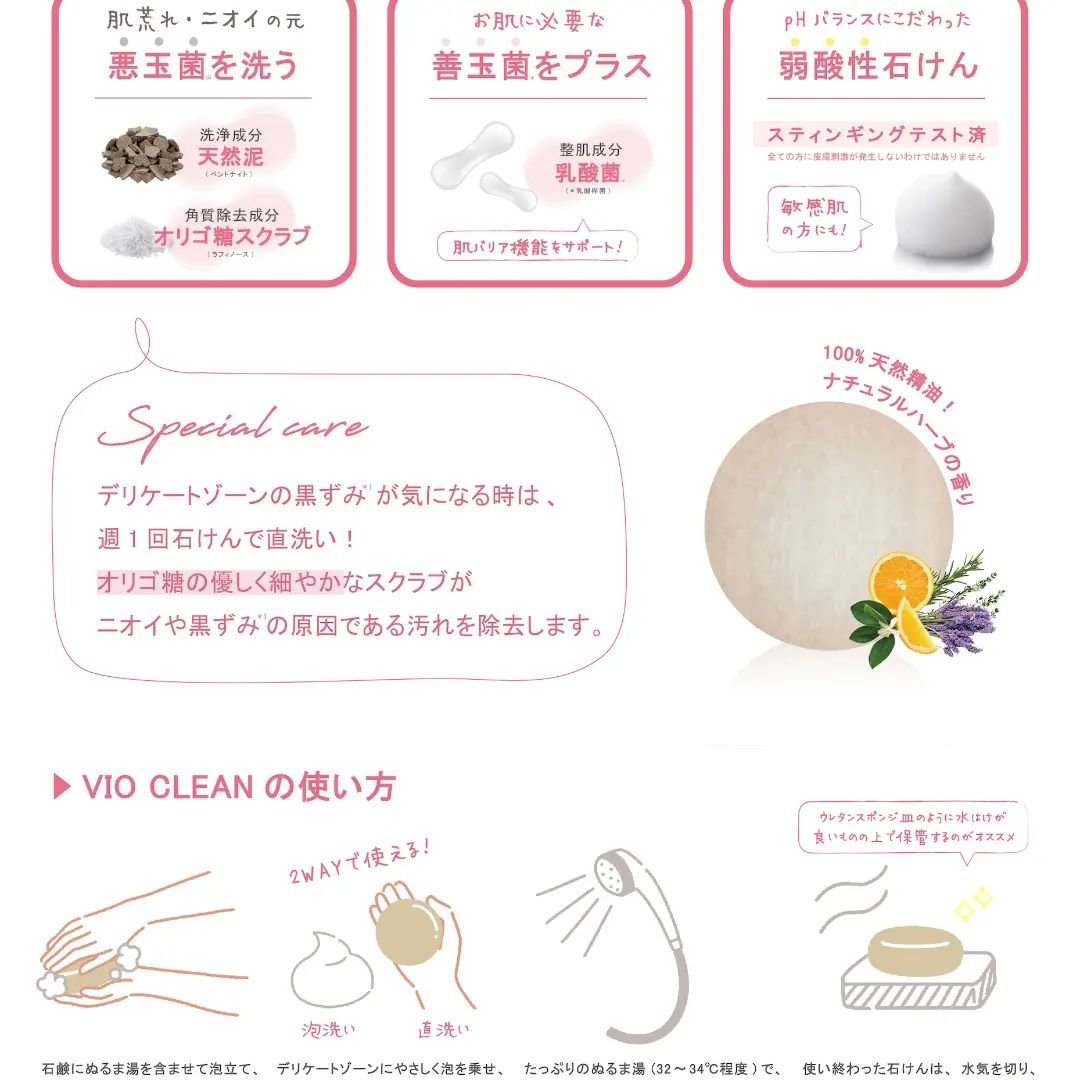- VIO CREANは、肌バリア機能を低下させる悪玉菌(黄色ブドウ球菌など)を含む汚れを天然泥で洗い流し、お肌に必要な善玉菌(乳酸桿菌:整肌成分)をプラス。 さらにこの石鹸はデリケートゾーンのお肌と同じ弱酸性お肌にやさしい洗い心地なので毎日お使いいただけます。 デリケートゾーンの黒ずみ汚れが気になる時は、週一回石鹸で直洗いするのがおすすめ。 オリゴ糖の細やかなスクラブが黒ずみ汚れやニオイの原因である汚れを除去します。