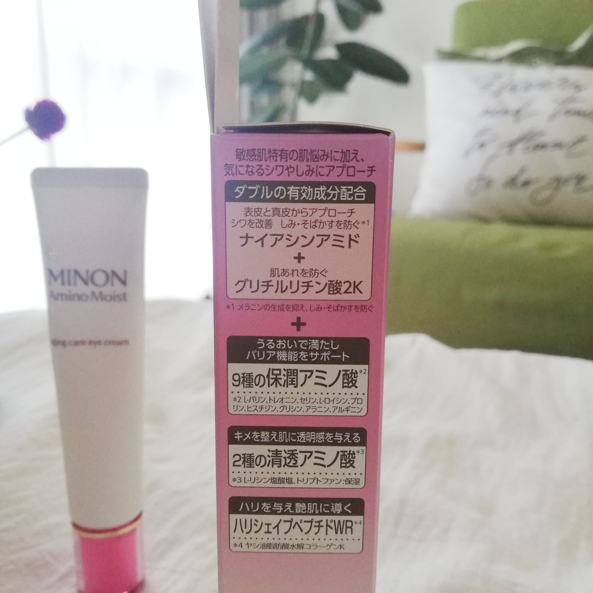 - 【敏感肌も使える薬用シワ改善アイクリーム】 ダブルの有効成分配合。気になるシワを改善し、しみ・そばかす*1、肌あれを防ぎます。 ●ナイアシンアミド:シワ改善&しみ予防 ●グリチルリチン酸2K:肌あれ予防 ハリを与えつや肌に導く「ハリシェイプペプチドWR*2」配合。 使い続けるたび、シワを改善し、うるおってハリのある明るい印象の目元へ。 エイジングケア:年齢に応じたお手入れケア *1メラニンの生成を抑え、しみ・そばかすを防ぐ *2ヤシ油脂肪酸水解コラーゲンK (販売名:ミノンアミノモイストAE)【医薬部外品】