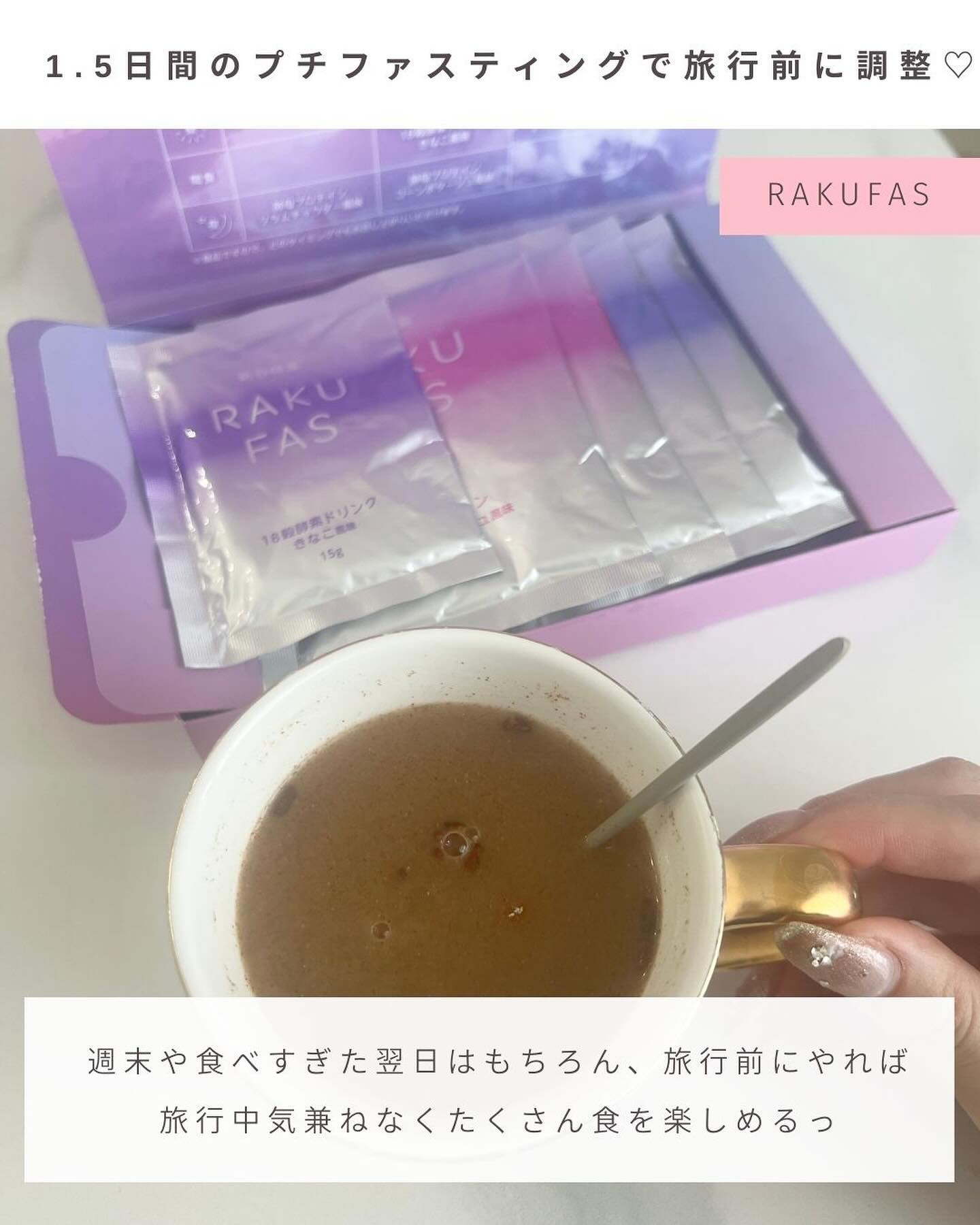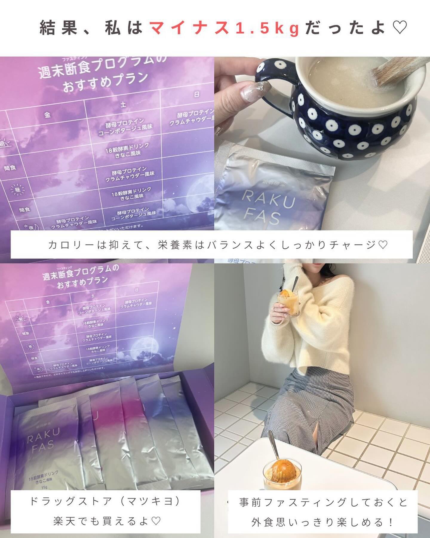 スープ大好きな私としては 美味しく、しかもたまにでいいので 楽々取り入れられました 3種類のお味! プロテインはお湯を注ぐだけ ドリンクはお水を 週末だけ食事を置きかえるだけで たった1.5日でスッキリ!