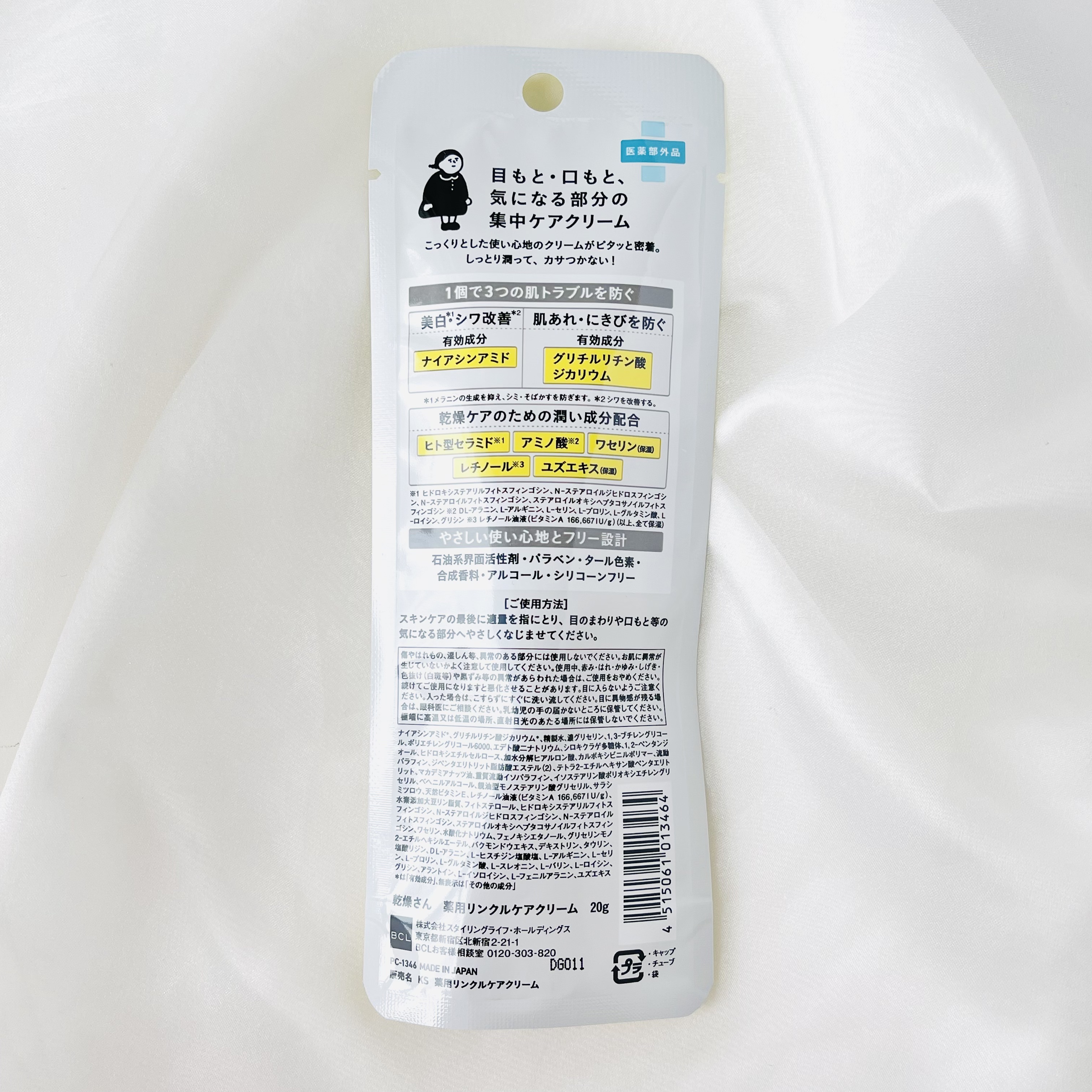 - <乾燥さん 薬用リンクルケアクリーム 【医薬部外品】> ナイアシンアミド、グリチルリチン酸ジカリウム、精製水、濃グリセリン、1,3–ブチレングリコール、ポリエチレングリコール6000、エデト酸二ナトリウム、シロキクラゲ多糖体、1,2–ペンタンジオール、ヒドロキシエチルセルロース、加水分解ヒアルロン酸、カルボキシビニルポリマー、流動パラフィン、ジペンタエリトリット脂肪酸エステル(2)、テトラ2–エチルヘキサン酸ペンタエリトリット、マカデミアナッツ油、重質流動イソパラフィン、イソステアリン酸ポリオキシエチレングリセリル、ベヘニルアルコール、親油型モノステアリン酸グリセリル、サラシミツロウ、天然ビタミンE、レチノール油液(ビタミンA 166,667IU/g)、水素添加大豆リン脂質、フィトステロール、ヒドロキシステアリルフィトスフィンゴシン、N–ステアロイルジヒドロスフィンゴシン、N–ステアロイルフィトスフィンゴシン、ステアロイルオキシヘプタコサノイルフィトスフィンゴシン、ワセリン、水酸化ナトリウム、フェノキシエタノール、グリセリンモノ2–エチルヘキシルエーテル、バクモンドウエキス、デキストリン、タウリン、塩酸リジン、DL–アラニン、L–ヒスチジン塩酸塩、L–アルギニン、L–セリン、L–プロリン、L–グルタミン酸、L–スレオニン、L–バリン、L–ロイシン、グリシン、アラントイン、L–イソロイシン、L–フェニルアラニン、ユズエキス