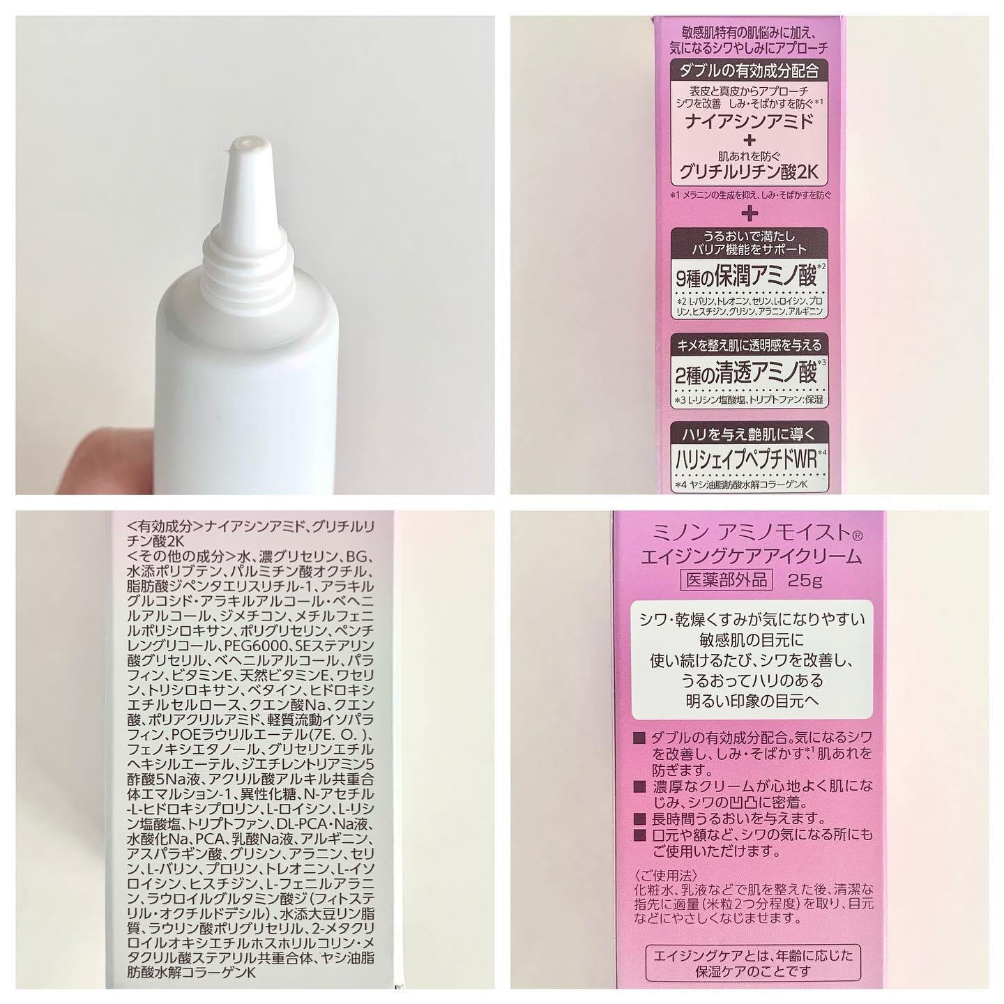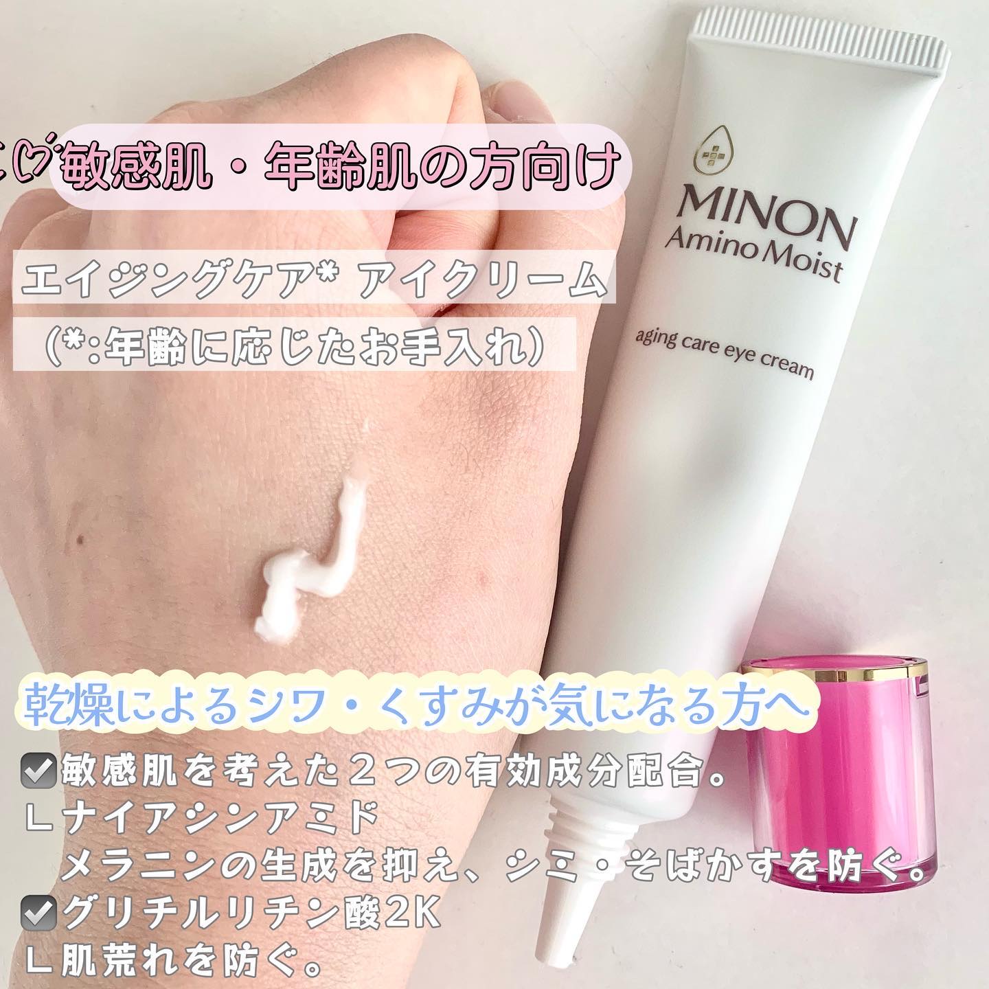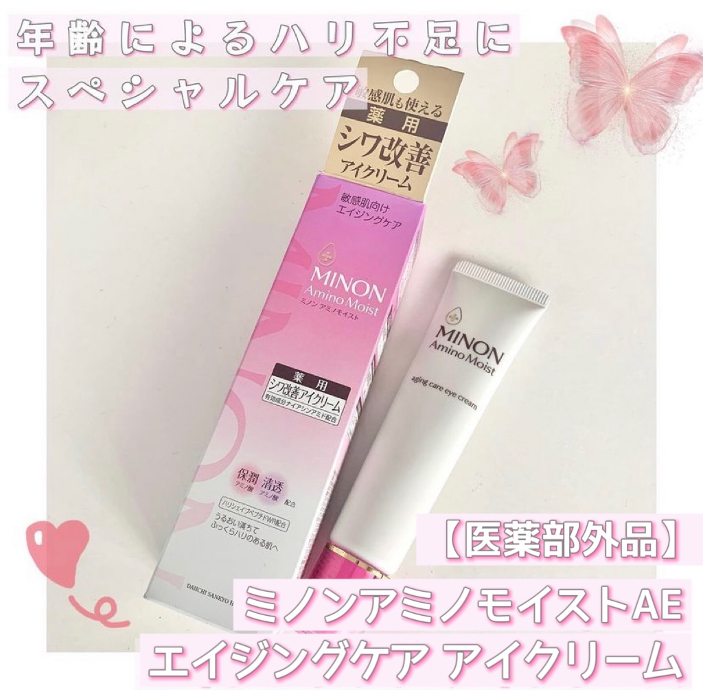 - 【敏感肌も使える薬用シワ改善アイクリーム】 ダブルの有効成分配合。気になるシワを改善し、しみ・そばかす*1、肌あれを防ぎます。 ●ナイアシンアミド:シワ改善&しみ予防 ●グリチルリチン酸2K:肌あれ予防 ハリを与えつや肌に導く「ハリシェイプペプチドWR*2」配合。 使い続けるたび、シワを改善し、うるおってハリのある明るい印象の目元へ。 エイジングケア:年齢に応じたお手入れケア *1メラニンの生成を抑え、しみ・そばかすを防ぐ *2ヤシ油脂肪酸水解コラーゲンK (販売名:ミノンアミノモイストAE)【医薬部外品】
