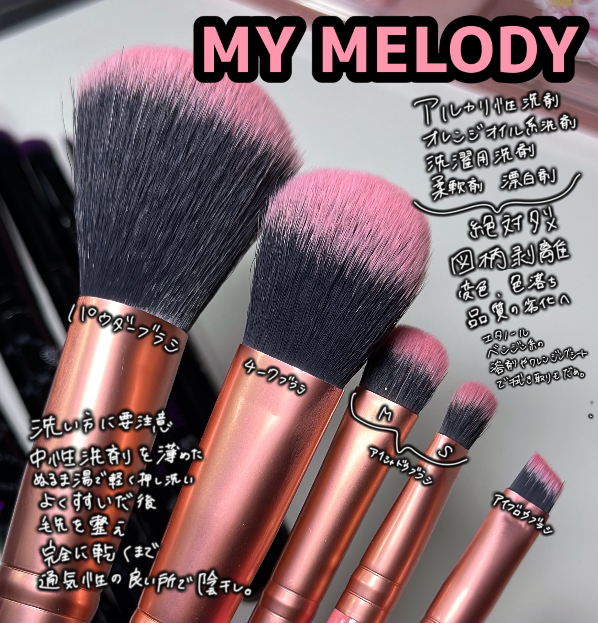 大2枚 中2枚 小2枚 計6枚 可愛いマイメロちゃんとクロミちゃん🥺 アイシャドウブラシはもちろん、フェイスブラシ、チークブラシ、大きい筆もすっぽりなサイズ!! 可愛くて便利なのでついつい買ってしまいました笑 Seriaで購入できるのでぜひ探してみてください🥰