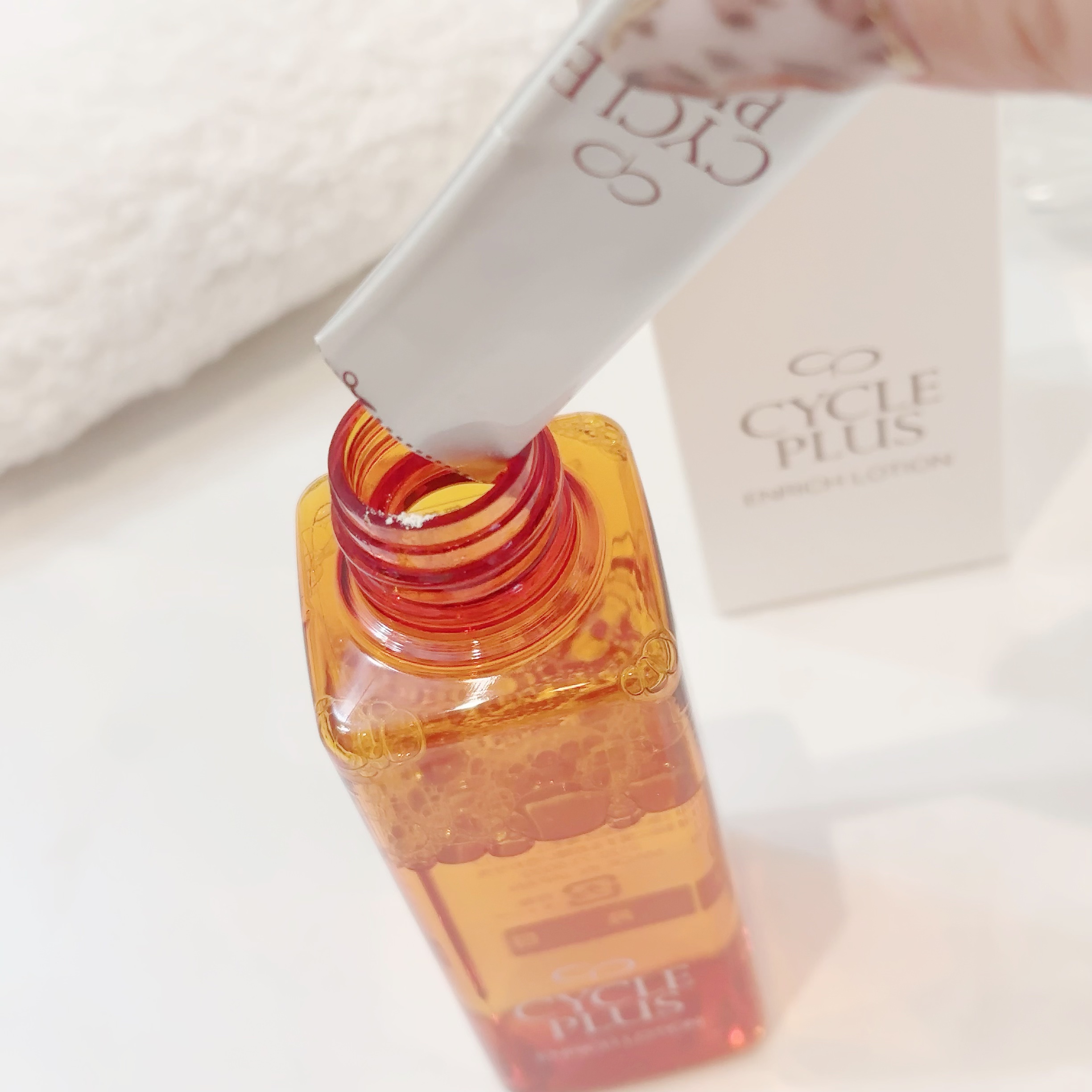 サイクルプラスエンリッチローション付属のパウダーを混ぜて20回ほど振って5分待てば完成!即効性と浸透力を考えた化粧水だから、翌朝から毛穴ケアできてる感じがして嬉しい✨#PR#supportedbynaris#サイクルプラス#ビタミンCスキンケ...