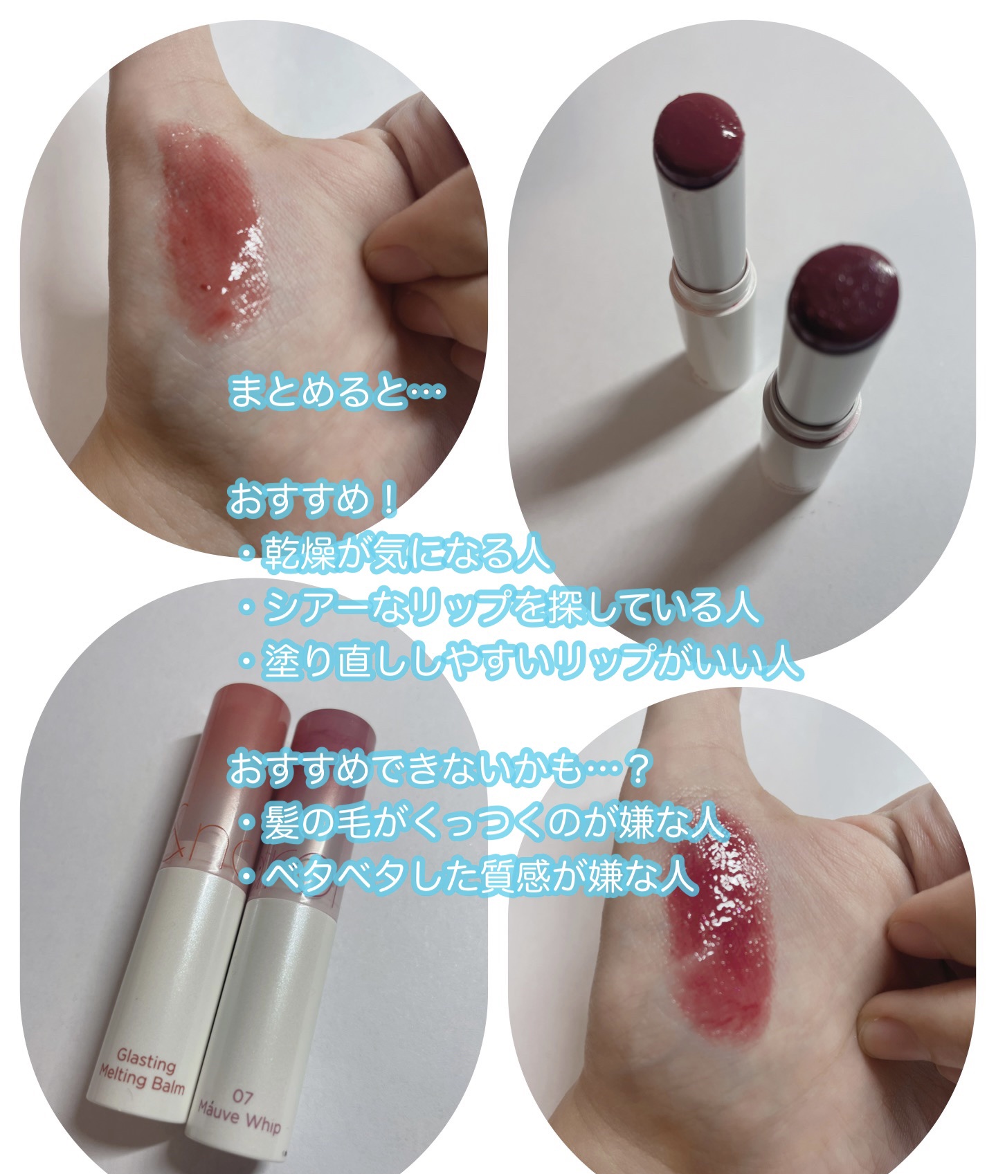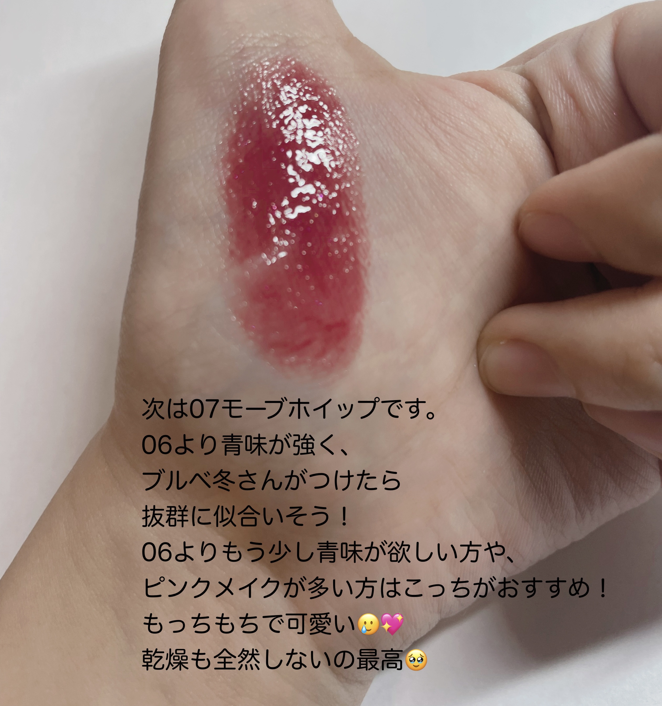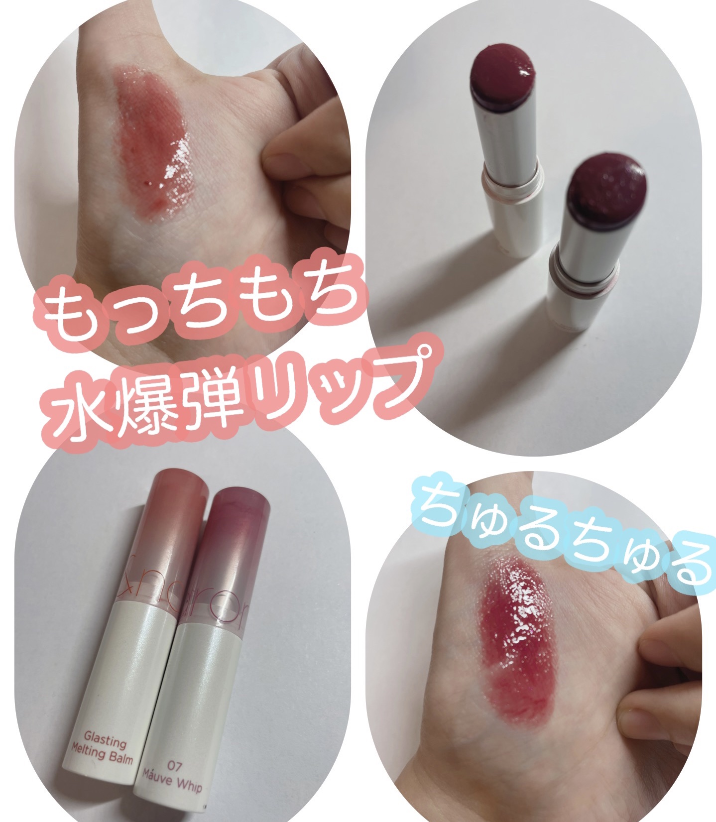 - もちっとした水膜で弾けそうなツヤリップ 1.軽い塗り心地のなめらかで透明な水爆弾ツヤ 2.塗った瞬間から唇を鮮やかに彩る多彩なカラーバーム 3.植物性保湿オイルでしっとりもっちり保湿バーム