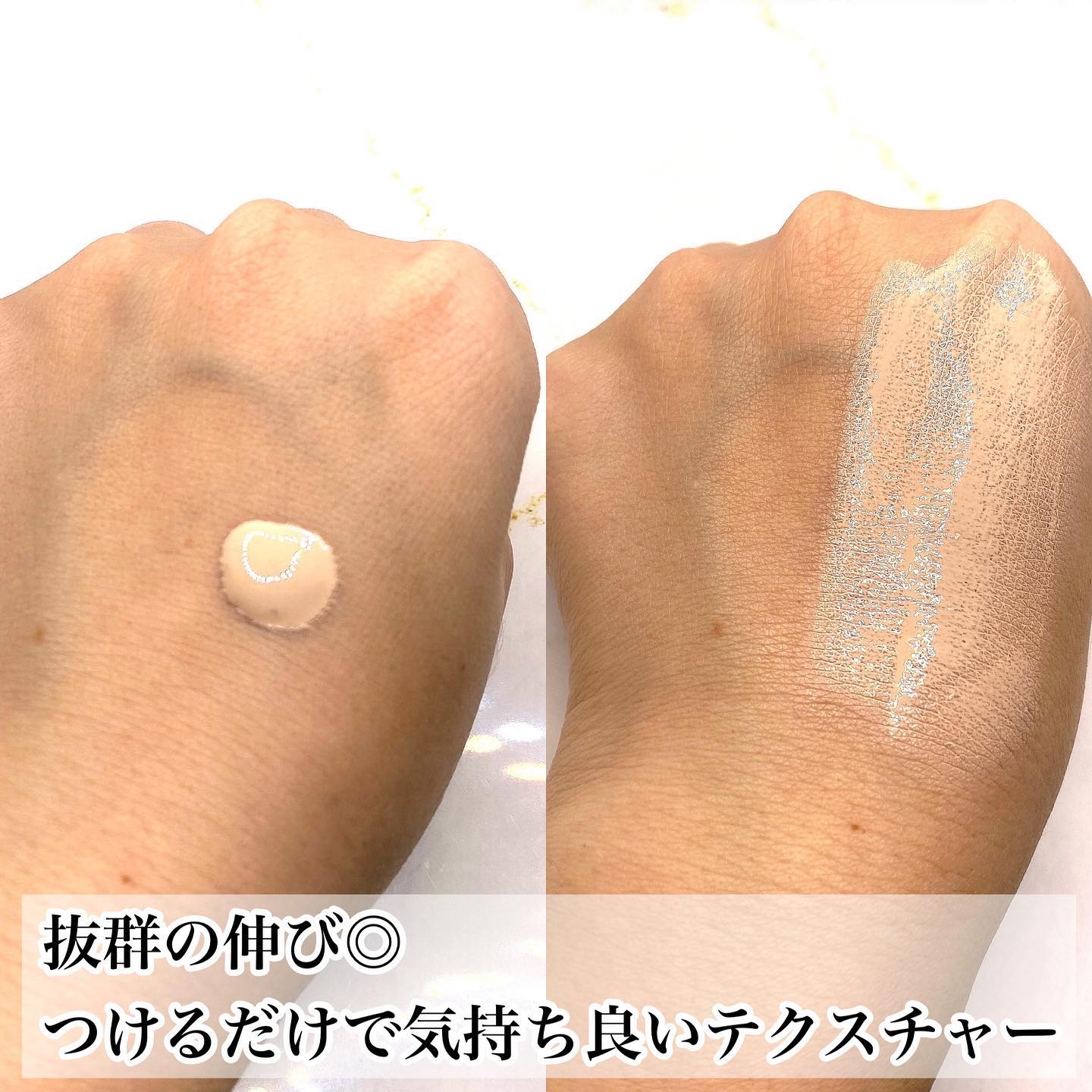 美容液を肌に塗っているような、とてもいい感じ♡ よりみずみずしいテクスチャー。 夕方までぜんぜん乾燥しない! 1日経つと少し乾燥が気になる。 どちらもナチュラルカバー。素肌が綺麗な人!という印象になれる。