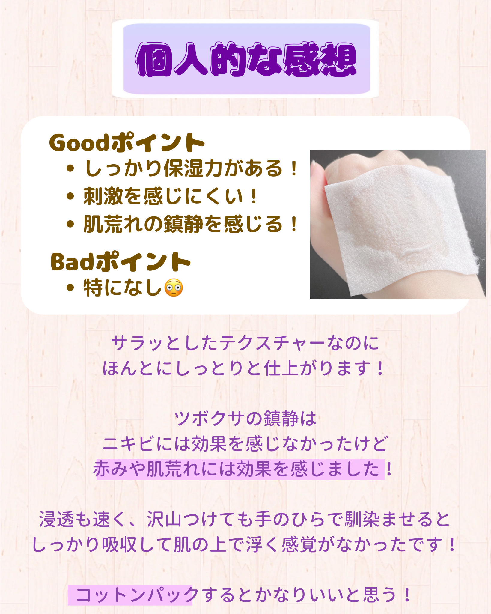トナーパッドよりツボクサエキスがたっぷり入って85%! 少しハーブ系の香りがするサラサラテクスチャー。 洗顔後1番最初のスキンケアだからこそ鎮静と保湿は大事🌱 角質ケアもしてくれるから、肌のキメも整えてくれる! みずみずしく、しっかり肌を整えてくれるトナー🌿