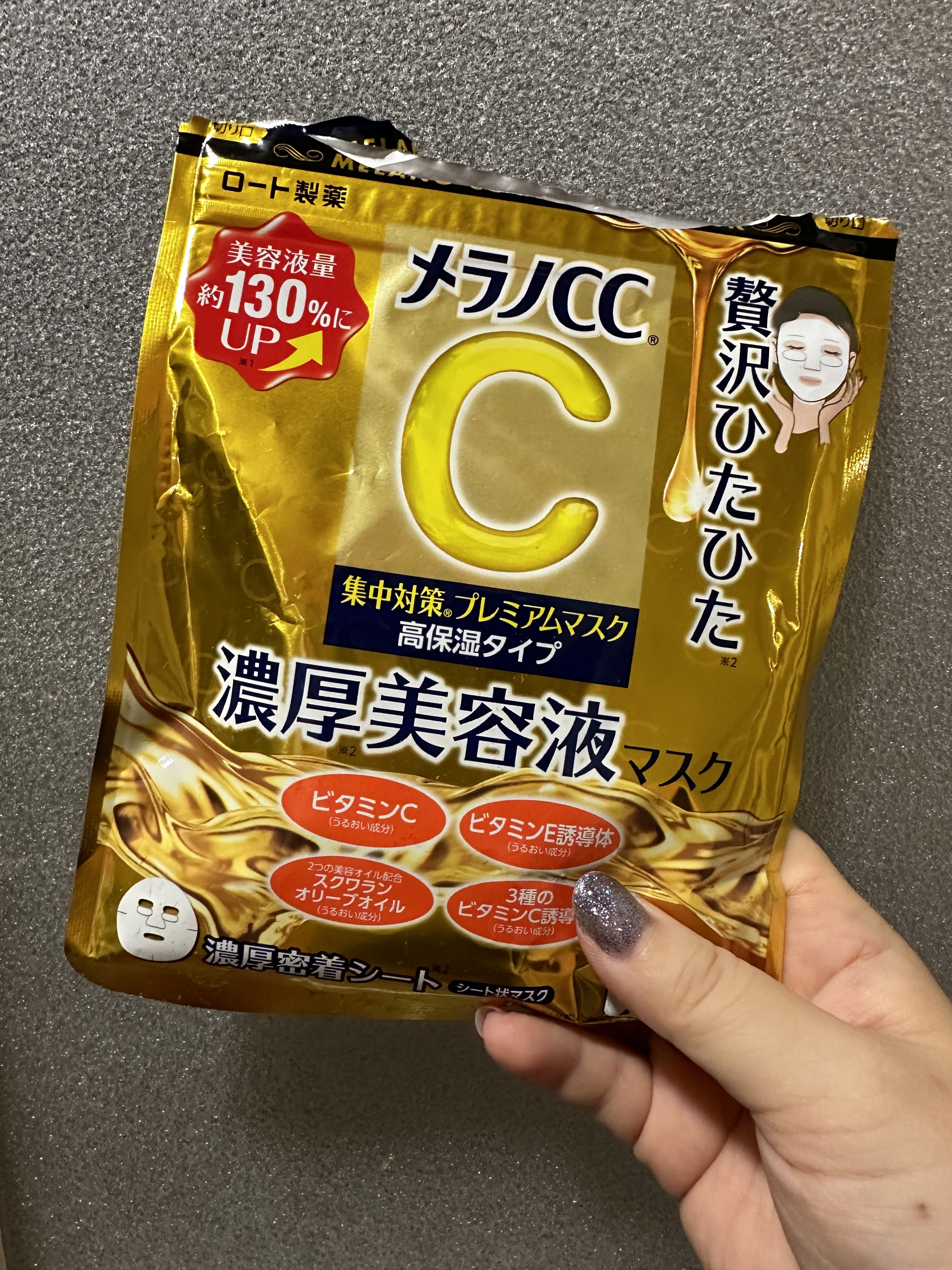 - 紫外線を浴びてしまった肌にもうるおいを。 美容液成分たっぷりうるおう、お得な大容量 「メラノCC 集中対策プレミアムマスクMK 高保湿タイプ」は、うるおい成分「ビタミンC※1」「ビタミンE誘導体※2」「3種のビタミンC誘導体※3」を配合したフェイスマスクです。 厚みと肌ざわりの気持ちいい3層構造シート採用。さらにうるおい成分であるグレープフルーツ果実エキス、レモン果実エキスを配合。 今回メラノCCブランドとして特別に2つの美容オイル(スクワラン、オリーブオイル※4)を配合。角質層すみずみに浸透するしっとり高保湿タイプです。 毎日のケアに使いやすい大容量20枚入り。爽やかな柑橘系の香り。 化粧水などで肌を整えた後にお使いください。美容液・乳液・クリーム等は、マスク使用後にお使いいただけます。 ※1アスコルビン酸 ※2酢酸トコフェロール ※33-O-エチルアスコルビン酸・アスコルビルグルコシド・テトラヘキシルデカン酸アスコルビル ※4:オリーブ果実油 ロート製薬とマツモトキヨシホールディングスとの共同企画