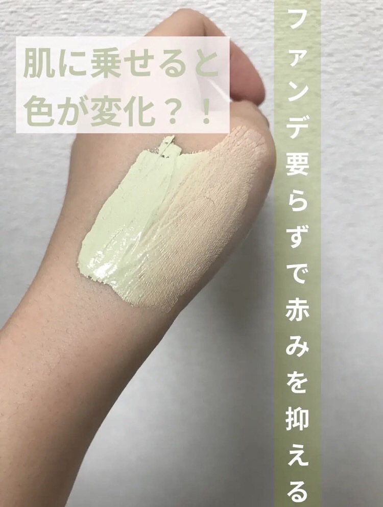 - 赤みをきちんとカバーするスキンケア兼用下地。緑色のクリームが肌でベージュ色に変化し、ニキビ跡やくすみをカバーします。