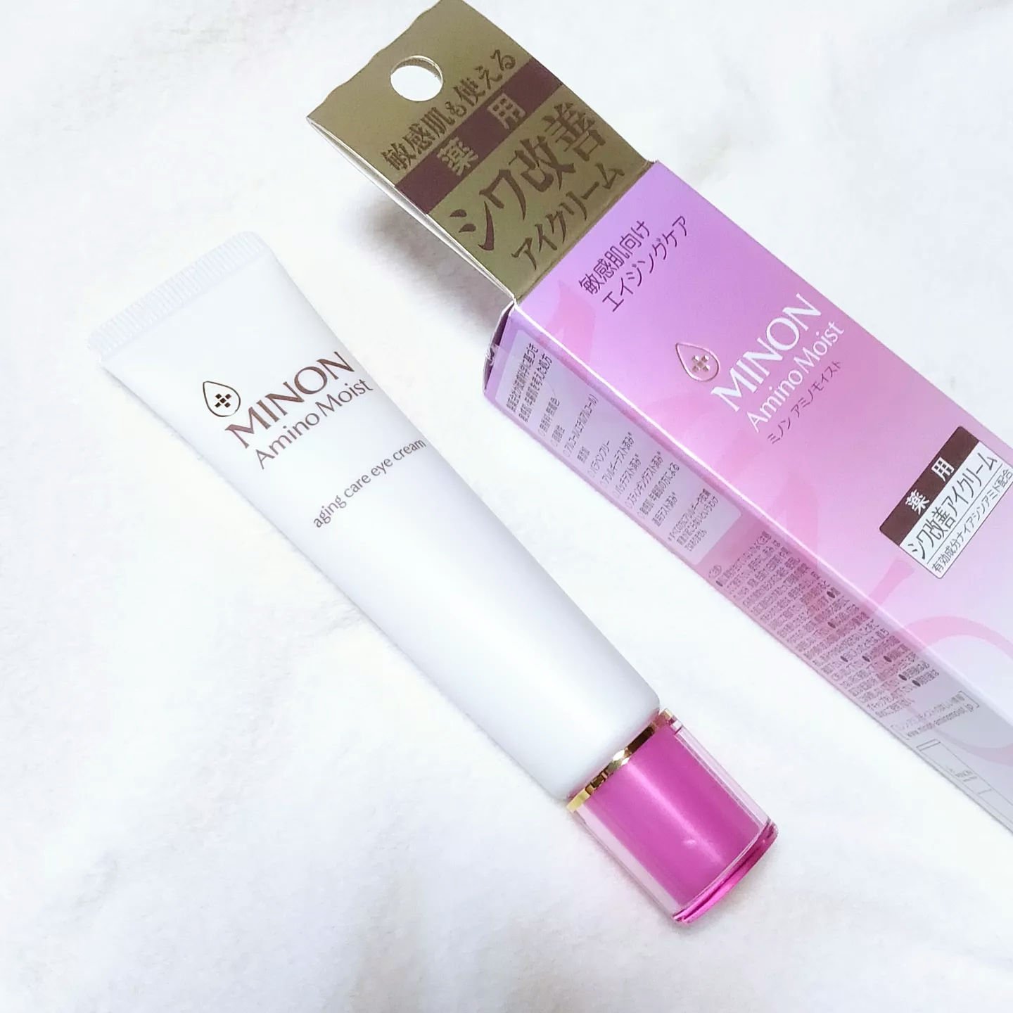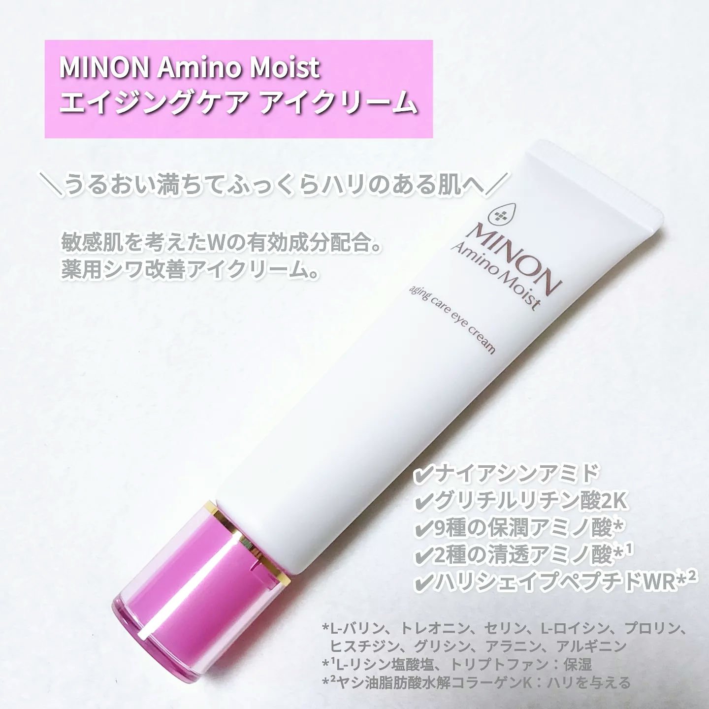 - 【敏感肌も使える薬用シワ改善アイクリーム】 ダブルの有効成分配合。気になるシワを改善し、しみ・そばかす*1、肌あれを防ぎます。 ●ナイアシンアミド:シワ改善&しみ予防 ●グリチルリチン酸2K:肌あれ予防 ハリを与えつや肌に導く「ハリシェイプペプチドWR*2」配合。 使い続けるたび、シワを改善し、うるおってハリのある明るい印象の目元へ。 エイジングケア:年齢に応じたお手入れケア *1メラニンの生成を抑え、しみ・そばかすを防ぐ *2ヤシ油脂肪酸水解コラーゲンK (販売名:ミノンアミノモイストAE)【医薬部外品】