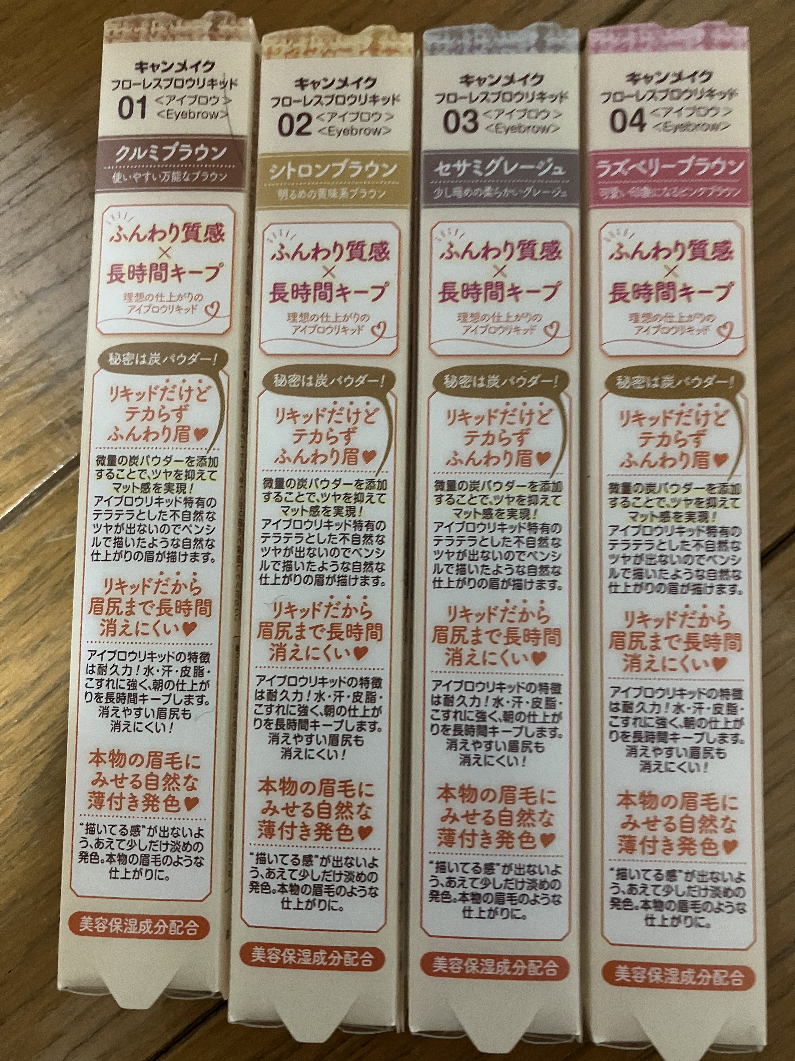 - 炭パウダー配合!ふんわり眉が長時間つづくリキッドアイブロウ! リキッドだけどテカらず、パウダリーな仕上がり。 リキッドだから眉尻まで長時間消えにくい! 本物のまゆげにみせる自然な薄付き発色 01 クルミブラウン…迷ったらこれ!使いやすい人気のブラウン 02 シトロンブラウン…明るめ黄みブラウン 03 セサミグレージュ…少し暗めのやわらかいグレージュ 04 ラズベリーブラウン…可愛い印象になるピンクブラウン