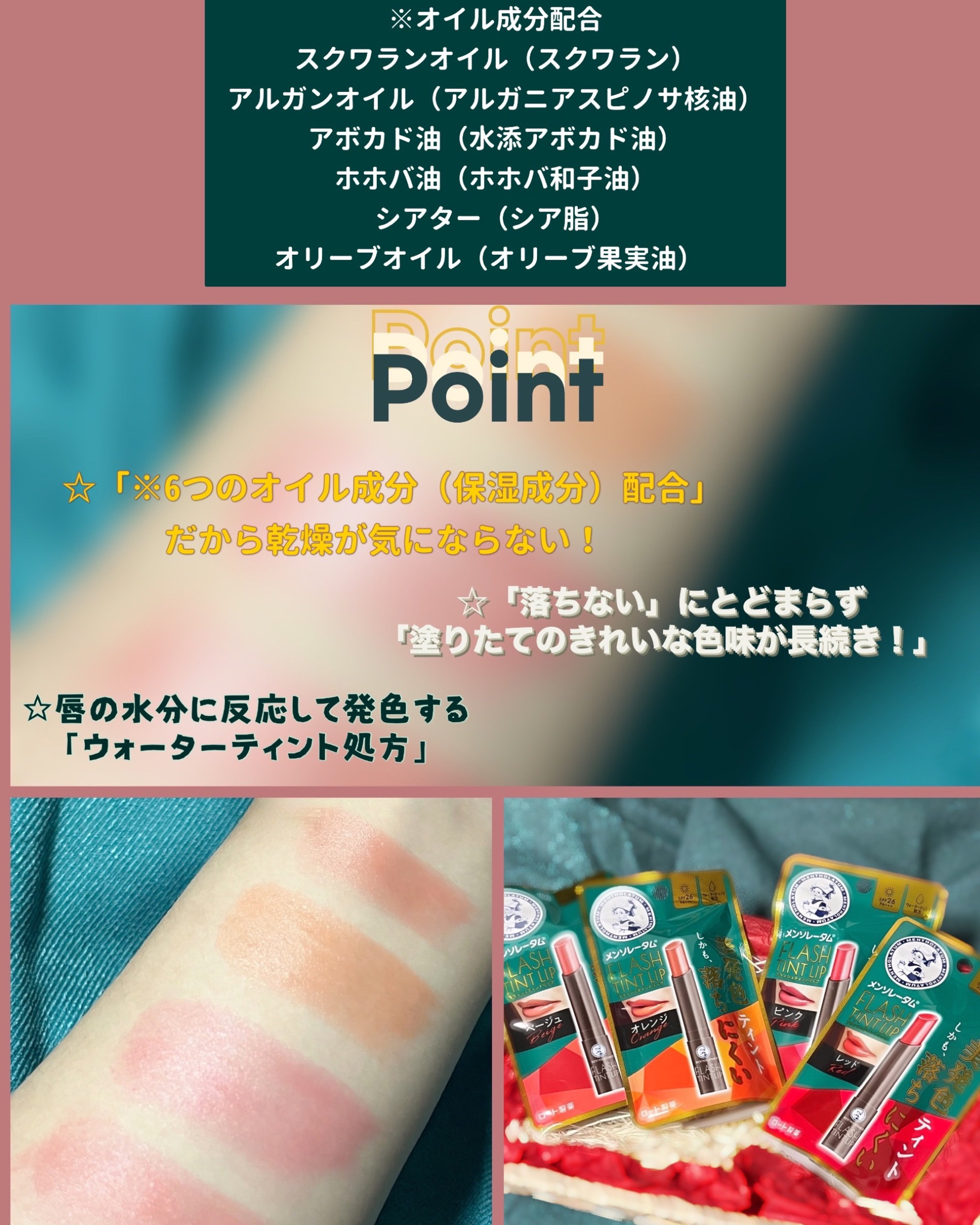 - <ピンク> スクワラン、トリ(カプリル酸/カプリン酸)グリセリル、パラフィン、水添ポリイソブテン、リンゴ酸ジイソステアリル、メトキシケイヒ酸エチルヘキシル、ビスジグリセリルポリアシルアジペート-2、トリポリヒドロキシステアリン酸ジペンタエリスリチル、ワセリン、シア脂、ポリエチレン、水添野菜油、アボカド油、トリイソステアリン酸ポリグリセリル-2、マイクロクリスタリンワックス、t-ブチルメトキシジベンゾイルメタン、オリーブ果実油、(VP/エイコセン)コポリマー、酸化チタン、ペンチレングリコール、黄4、赤202、赤201、マイカ、赤218、ホホバ種子油、アルガニアスピノサ核油、水酸化Al、酸化スズ <ブラウン> スクワラン、トリ(カプリル酸/カプリン酸)グリセリル、パラフィン、水添ポリイソブテン、メトキシケイヒ酸エチルヘキシル、リンゴ酸ジイソステアリル、ビスジグリセリルポリアシルアジペート-2、トリポリヒドロキシステアリン酸ジペンタエリスリチル、ワセリン、シア脂、ポリエチレン、水添野菜油、アボカド油、トリイソステアリン酸ポリグリセリル-2、マイクロクリスタリンワックス、t-ブチルメトキシジベンゾイルメタン、酸化鉄、(VP/エイコセン)コポリマー、オリーブ果実油、青1、ペンチレングリコール、酸化チタン、マイカ、赤223、ホホバ種子油、アルガニアスピノサ核油、酸化スズ <ベージュ> スクワラン、トリ(カプリル酸/カプリン酸)グリセリル、パラフィン、水添ポリイソブテン、リンゴ酸ジイソステアリル、メトキシケイヒ酸エチルヘキシル、ビスジグリセリルポリアシルアジペート-2、トリポリヒドロキシステアリン酸ジペンタエリスリチル、ワセリン、シア脂、ポリエチレン、水添野菜油、アボカド油、トリイソステアリン酸ポリグリセリル-2、マイクロクリスタリンワックス、t-ブチルメトキシジベンゾイルメタン、酸化チタン、酸化鉄、(VP/エイコセン)コポリマー、オリーブ果実油、ペンチレングリコール、マイカ、黄4、赤202、酸化スズ、水酸化Al、赤223、ホホバ種子油、アルガニアスピノサ核油 <レッド> スクワラン、トリ(カプリル酸/カプリン酸)グリセリル、パラフィン、水添ポリイソブテン、リンゴ酸ジイソステアリル、メトキシケイヒ酸エチルヘキシル、ビスジグリセリルポリアシルアジペート-2、トリポリヒドロキシステアリン酸ジペンタエリスリチル、ワセリン、シア脂、ポリエチレン、水添野菜油、アボカド油、トリイソステアリン酸ポリグリセリル-2、マイクロクリスタリンワックス、t-ブチルメトキシジベンゾイルメタン、(VP/エイコセン)コポリマー、オリーブ果実油、酸化チタン、ペンチレングリコール、黄4、赤201、マイカ、赤202、酸化スズ、赤218、ホホバ種子油、アルガニアスピノサ核油 <オレンジ> スクワラン、トリ(カプリル酸/カプリン酸)グリセリル、パラフィン、水添ポリイソブテン、リンゴ酸ジイソステアリル、メトキシケイヒ酸エチルヘキシル、ビスジグリセリルポリアシルアジペート-2、トリポリヒドロキシステアリン酸ジペンタエリスリチル、ワセリン、シア脂、ポリエチレン、水添野菜油、アボカド油、トリイソステアリン酸ポリグリセリル-2、マイクロクリスタリンワックス、t-ブチルメトキシジベンゾイルメタン、酸化鉄、(VP/エイコセン)コポリマー、オリーブ果実油、ペンチレングリコール、黄4、酸化チタン、マイカ、赤223、ホホバ種子油、アルガニアスピノサ核油、酸化スズ