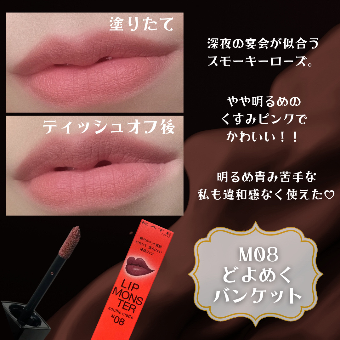 【使った商品】#KATE#リップモンスタースフレマットM04#ゴーストムーン0:00AM#リップモンスタースフレマットM06#掘りたて紅土#リップモンスタースフレマットM07#焦がしパンの運命【色味】M04オレンジ🍊𝟭𝘀イべ秋𝟮𝗻𝗱ブルベ夏の...