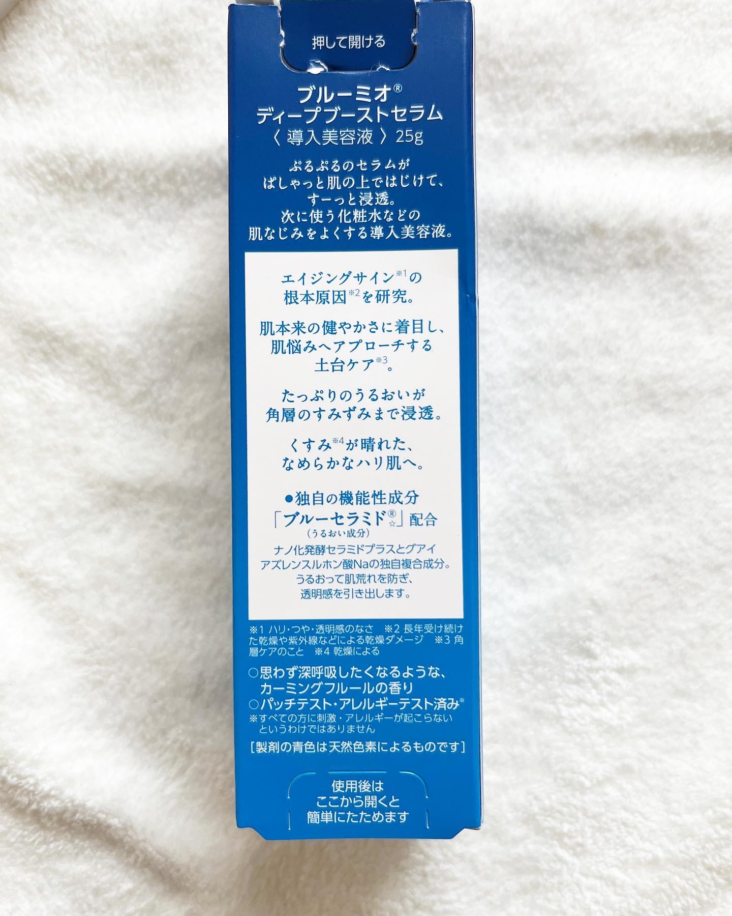 エイジングサイン※1の根本原因※2にアプローチ【BLOOMIO ブルーミオディープブーストセラム】次に使う化粧水などの肌なじみをよくする導入美容液です。色味は薄い青で、みずみずしいジェルです。スーッとお肌になじんでくれますよ。ベタつきもありま...