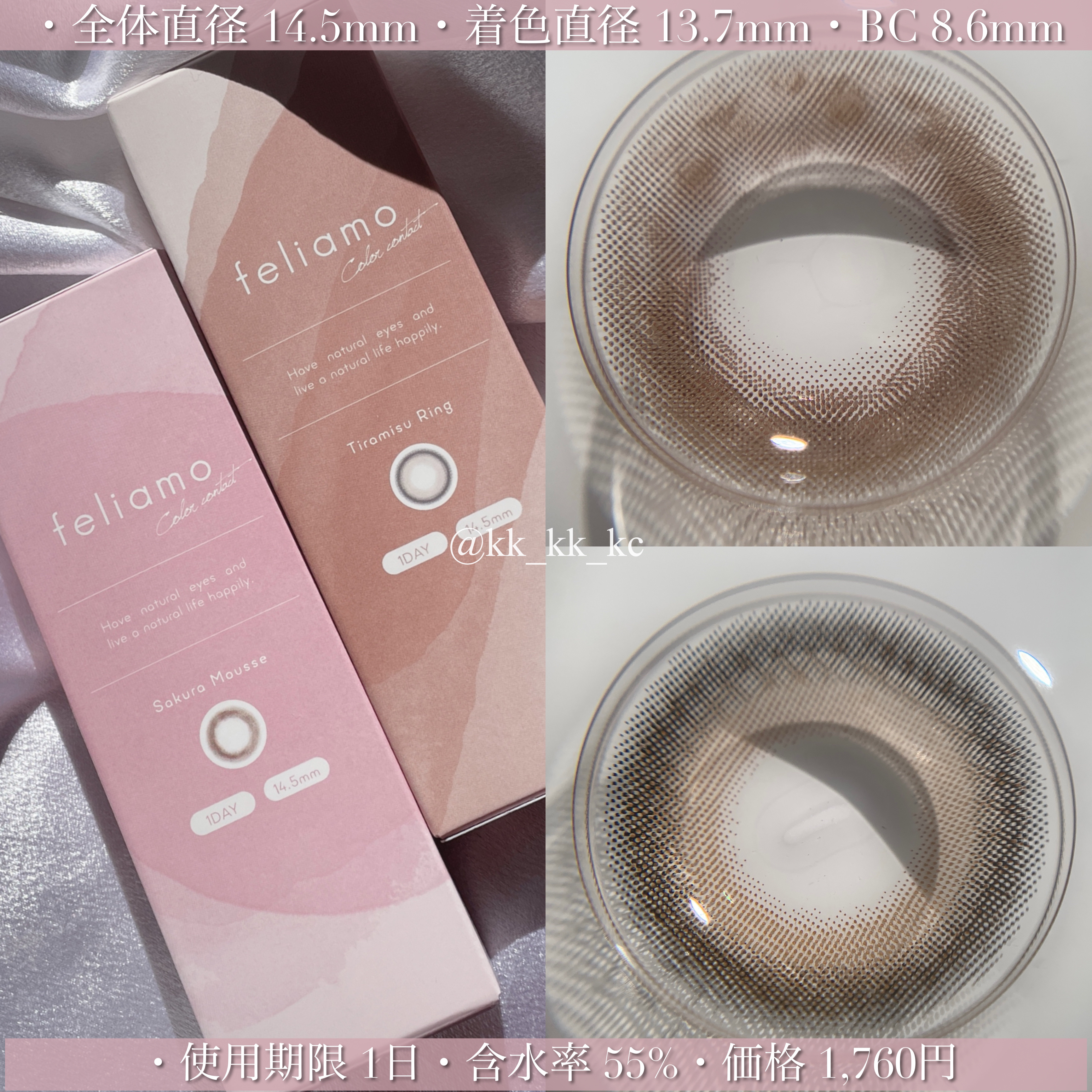 - ※2025年6月以降、商品パッケージ裏面・側面の一部表記を順次変更いたします。尚、これにかかる商品の交換・返品は承っておりません。 どんな瞬間にも溶け込む誰からも愛される瞳へ feliamoの由来は felice amore~幸せな愛~ 瞳から愛されオーラを放つ好印象レンズで女性らしさと品を演出。 オンも、オフも、特別な日も。 どんな場面にも溶け込むレンズラインナップで誰からも愛される瞳に。 UV CUT Feature1 肌や瞳に有害といわれ、白内障などの眼病を引き起こす危険性のある紫外線を99%カットします。(UV-A波75%、UV-B波99%カット) イオン性 Feature1 水分を多く含み酸素を通しやすいため瞳にやさしい使い心地で、快適な装用感です。 高含水 Feature1 水分が多く含むやわらかい素材で、快適なつけ心地です。 レンズ構造 Feature1 まぶた側に着色剤を内包しているため、角膜に色素が触れることがない構造を採用しています。 レンズ形状 Feature1 フチを丸みのある形状にすることで自然な装用感を実現しました。 ※装用感には個人差があります。 カラーコンタクトレンズの不適正使用による眼障害の危険性等などがあります。 ●コンタクトレンズは高度管理医療機器です。不十分な洗浄・消毒など不適切なケアや、長時間・交換期間を超えた装用により、アレルギー性結膜炎、角膜感染症、角膜潰瘍等の重篤な眼障害が発生する危険性があります ●ご使用前に取扱説明書を確認してください 使用上の留意事項 ●眼科医院等を受診してからお求めください ●眼に異常を感じたら直ちにレンズ使用を中止し、お近くの眼科等で診察を受けてください ●医師の指示にしたがってご使用ください ●コンタクトレンズを装用する場合、自覚症状がなくても、眼科医院等での定期検査を受けてください ●レンズに不具合がある場合は使用しないでください