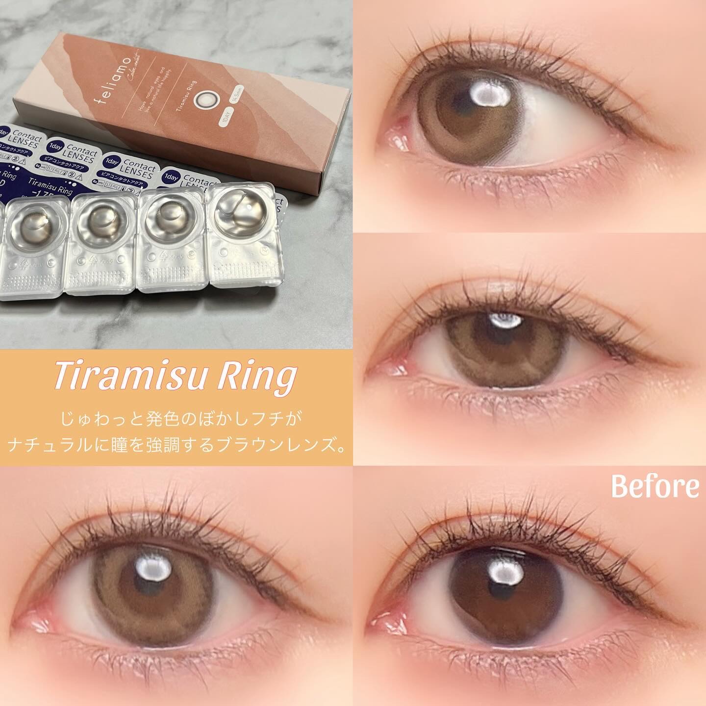 ナチュラルな細フチと透明感ブラウンが自然に瞳を綺麗にみせる裸眼盛れレンズ。 くっきり太フチと艶っぽブラウンがきゅるっとドーリーな瞳。 じゅわっと発色のぼかしフチでナチュラルに瞳を強調!甘かわ盛れ。